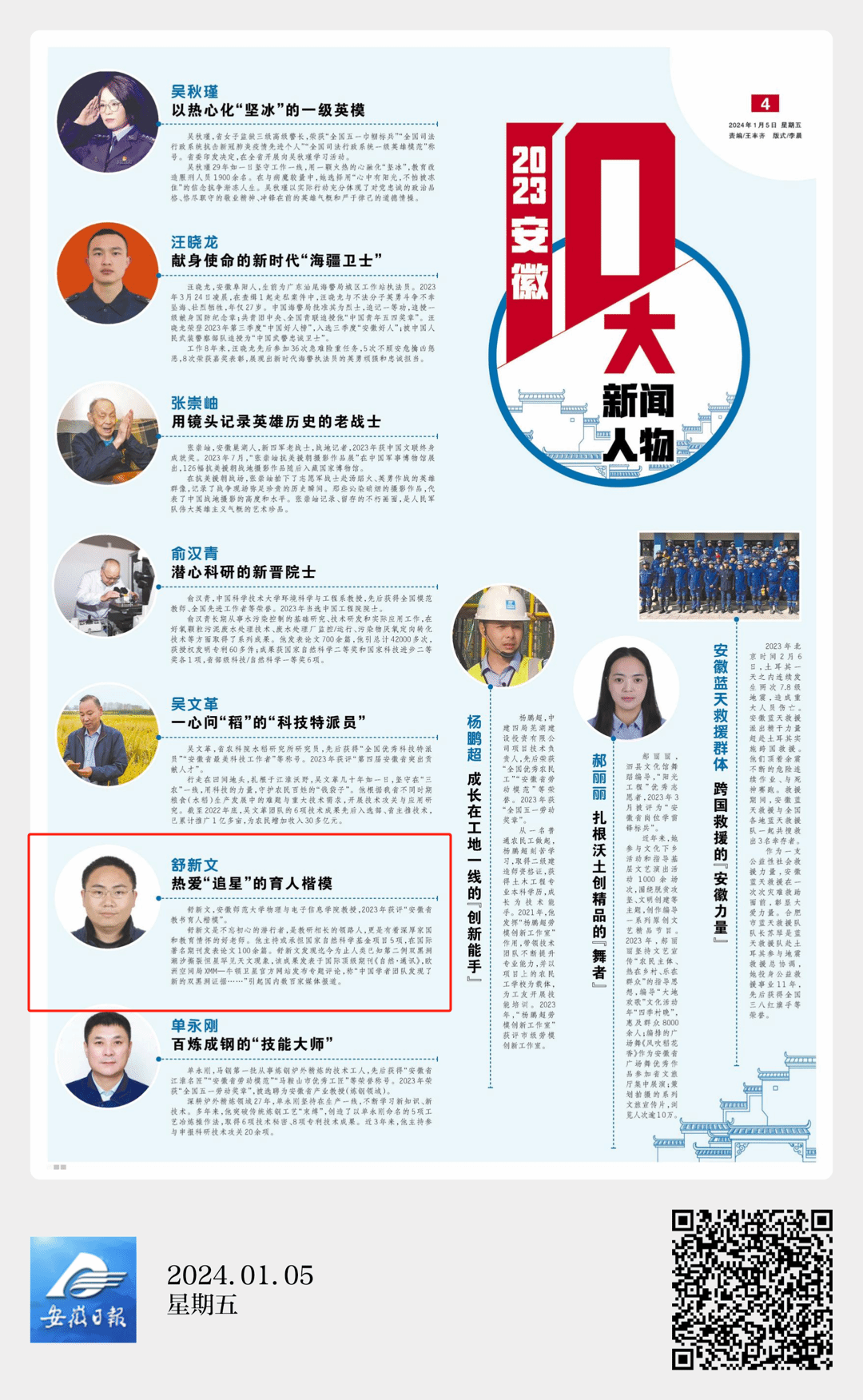 舒新文教授入选2023年度安徽“十大新闻人物”。