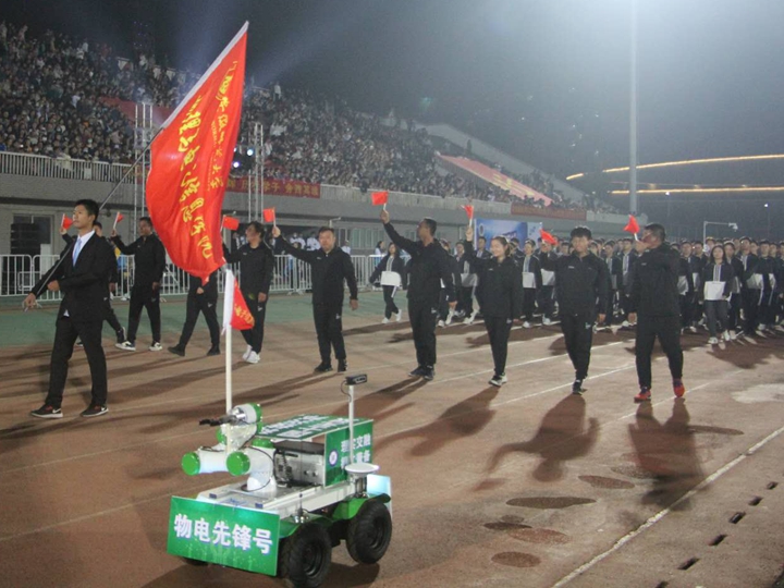 国士无双,科技兴邦10月27日晚,校运会开幕式上免费足球直播app 方阵队迈着整齐坚定的步伐,喊着铿锵有力的口号,在免费足球直播app 特色科技创新作品“物电先锋号”机器小车的引领走过主席台,向全校师生展示了物电人的风采。免费足球直播app 方阵元素:国士无双,科技兴邦!在特殊年份用这种特别的方式向抗疫英雄致敬。排舞队整齐划一的舞步跳出了物电学子的青春活力,一曲《我们都是追梦人》点燃了全场的热情,将开幕式气氛推向高潮。