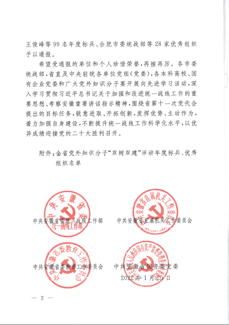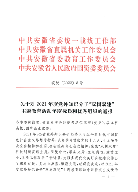 近日,安徽省委统战部、省直机关工委、省委教育工委和省国资委党委等四部门联合发文,对2021年度安徽省党外知识分子“双树双建”活动年度标兵和优秀组织进行通报表彰,我校欧美同学会副会长、九三学社基层委员会副主委、免费足球直播app-最快足球比分网