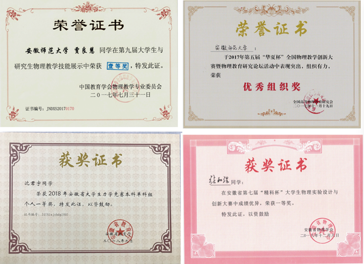 物理学专业注重师范生从教技能培养,形成了中学物理创新实验设计与自制教具竞赛等品牌活动。连续四年代表学校理科组参加安徽省高校师范生教学技能大赛均获得一等奖。依托省重点实验室等高端科研平台,形成了完善的卓越教师和拔尖人才融合培养模式。