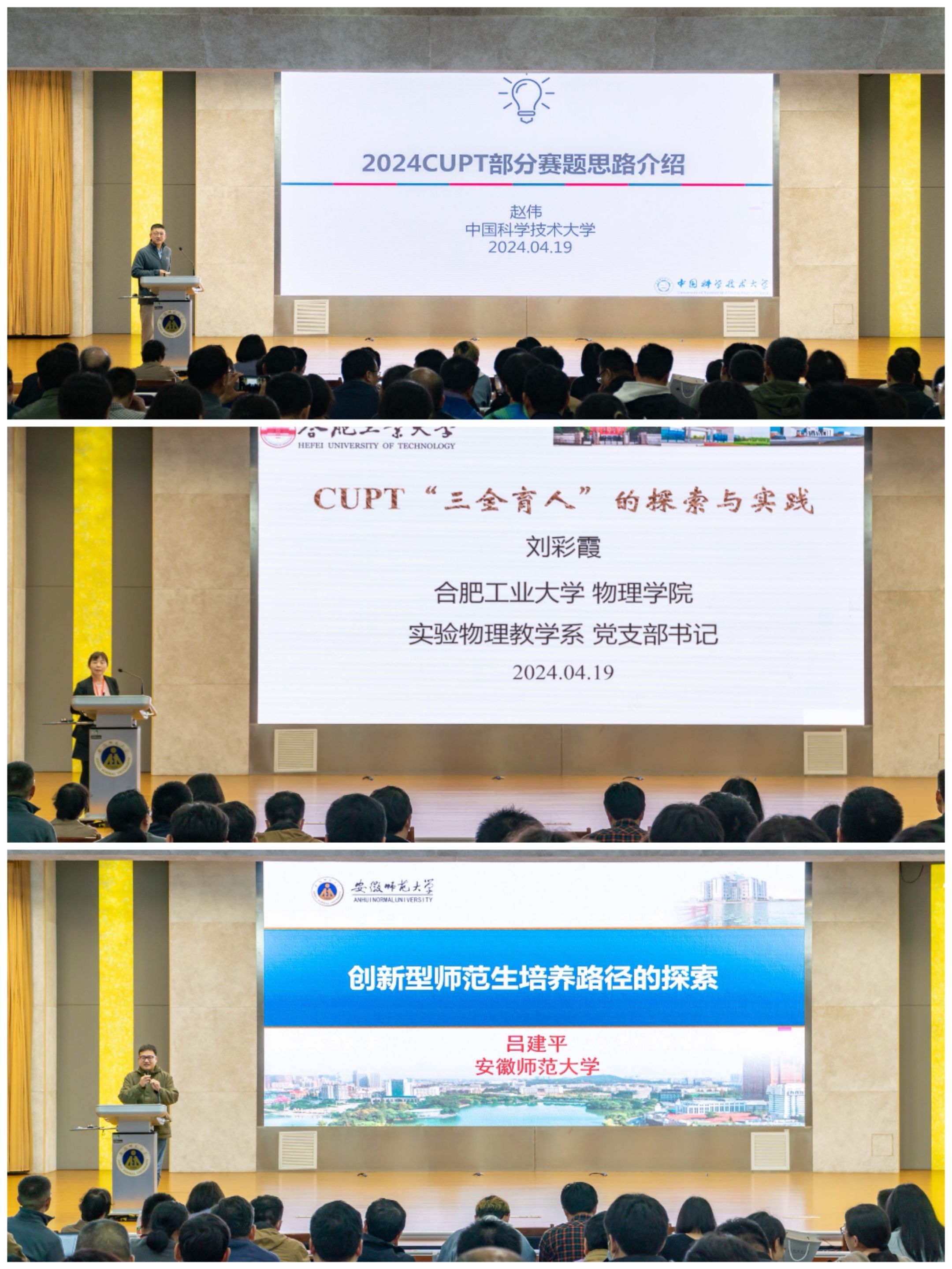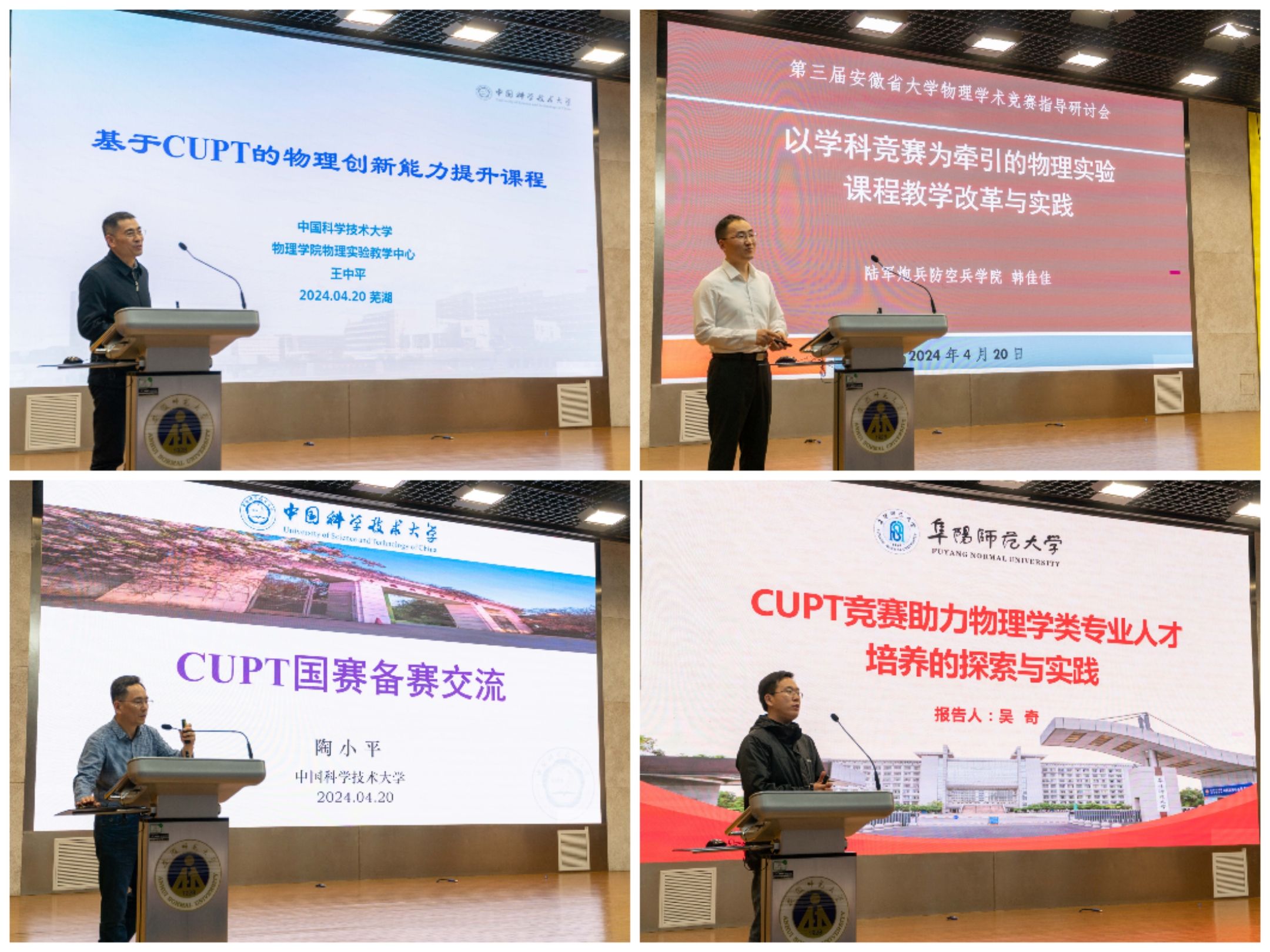 韩佳佳围绕物理实验课程改革与实践详细阐述学科竞赛在改革过程中的牵引及指导作用,并对改革举措及改革效果做了分析与报告;中国科学技术大学的陶小平以CUPT国赛的备为主题,从竞赛发展、备赛历程、能力提升、教学成效、赛题回顾几个方面开展经验交流;阜阳师范大学的吴奇则从物理学类专业人才培养出发,探讨CUPT竞赛在助力专业人才培养中的重要作用,分享阜阳师范大学在竞赛过程中所做的探索与实践以及人才培养理念。