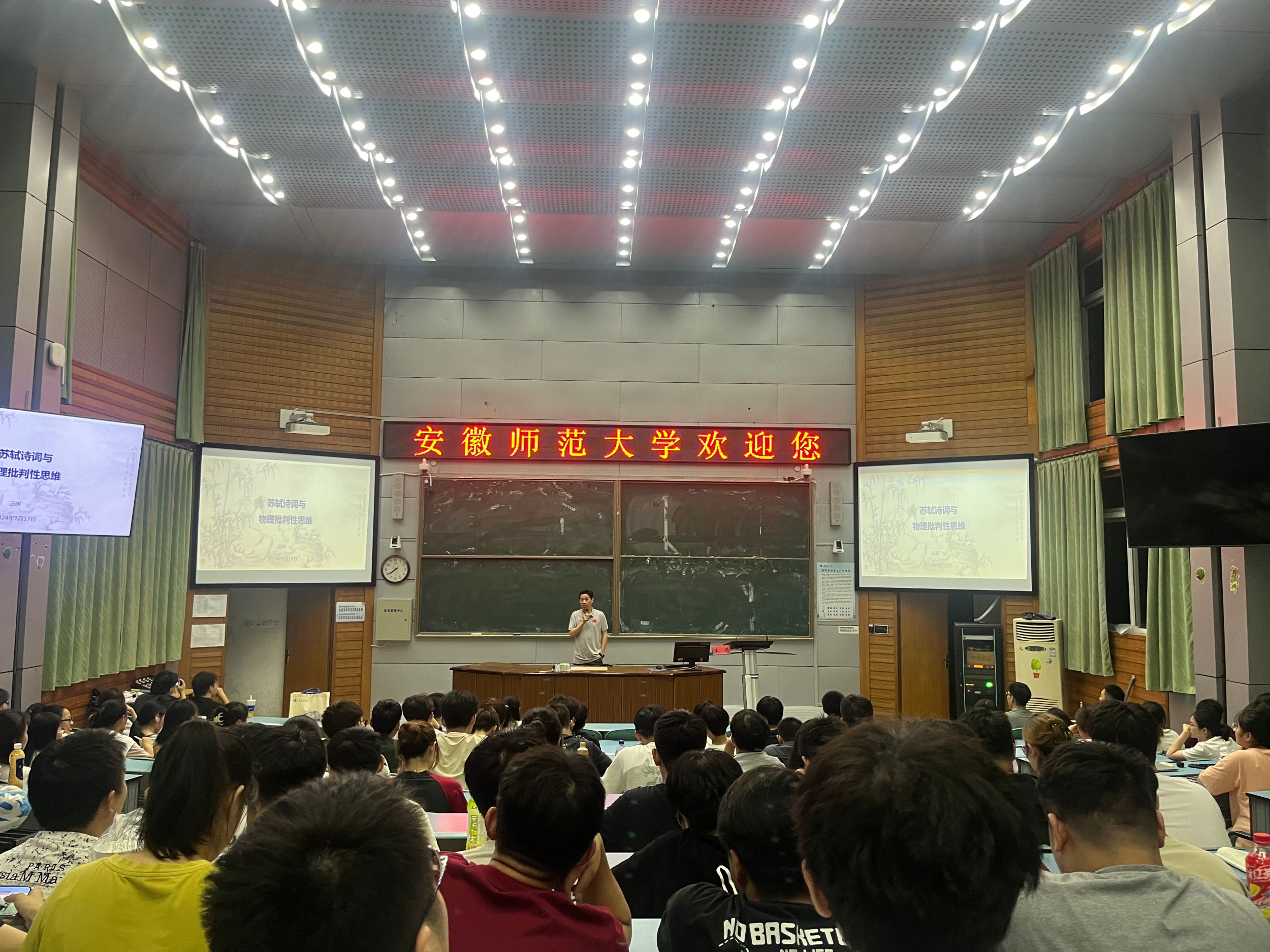 汪明以苏轼名篇《水调歌头•明月几时有》为例,剖析古诗词中蕴含的物理现象和背后的物理原理,指出科学问题不等于“现象+问号”,要学会运用批判性思维诱发物理核心概念规律的思考,在人文欣赏中结合理性思维特质,引入对问题的反复、严肃、持续不断的提问和批判性审视,旨在提升学生物理核心素养。他特别强调,批判性思维是马克思主义哲学的精髓,作为物理专业学生,要逐步养成批判性思维,科学与人文交汇才是教师迸发创新创造力的源泉。会上,同学们认真聆听,仔细记录,共同探讨古诗词中的物理奥秘。
