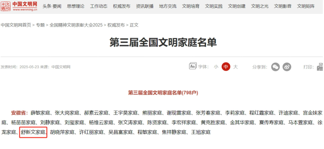 舒新文教授家庭获评第三届“全国文明家庭”。