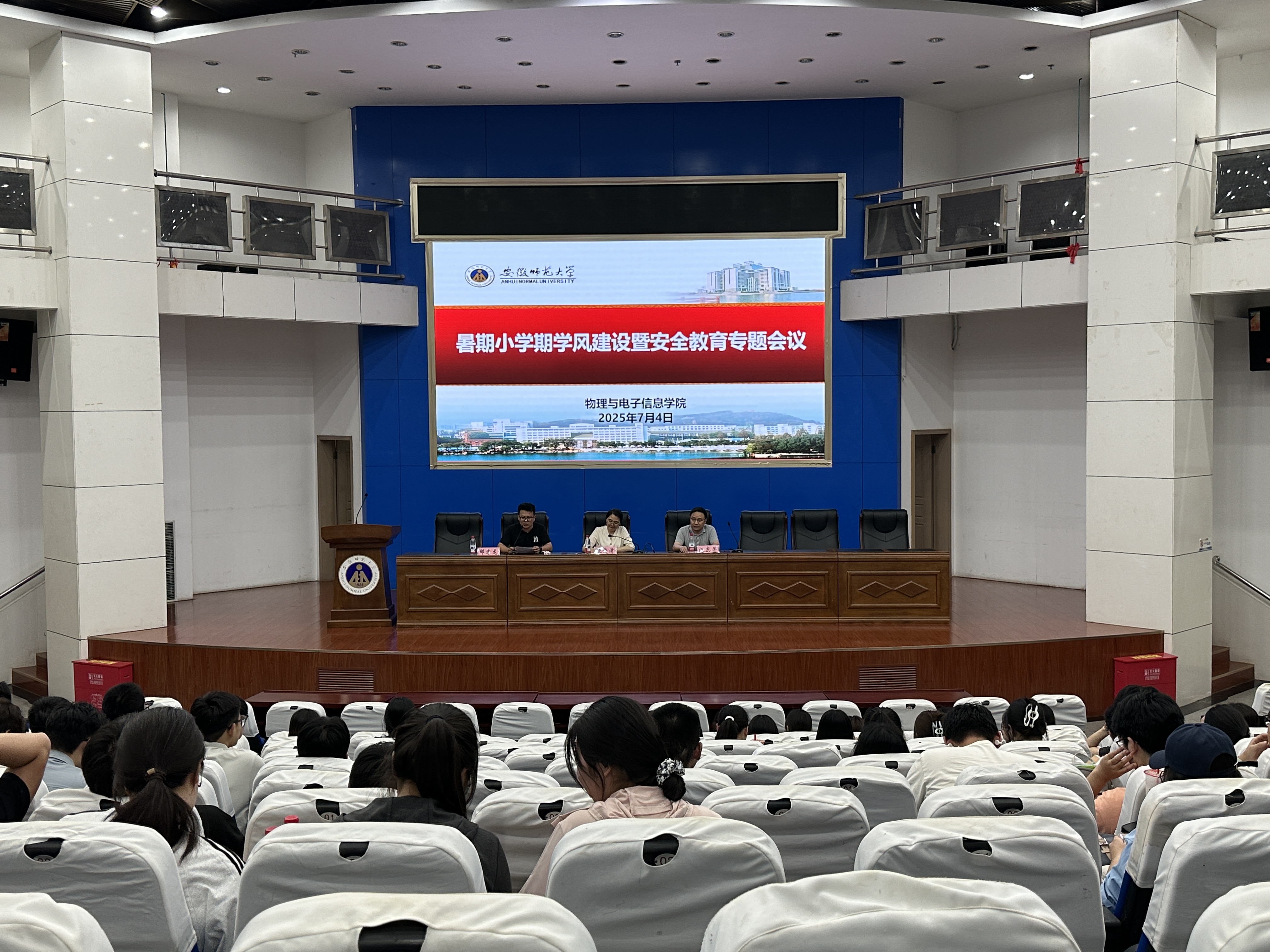 在图书馆敬文报告厅召开2025年暑期小学期学风建设暨安全教育专题会议,教学副院长张爱清、物理系副主任汪志荣出席会议,小学期全体参训学员参会。会议由辅导员邹孝龙主持。