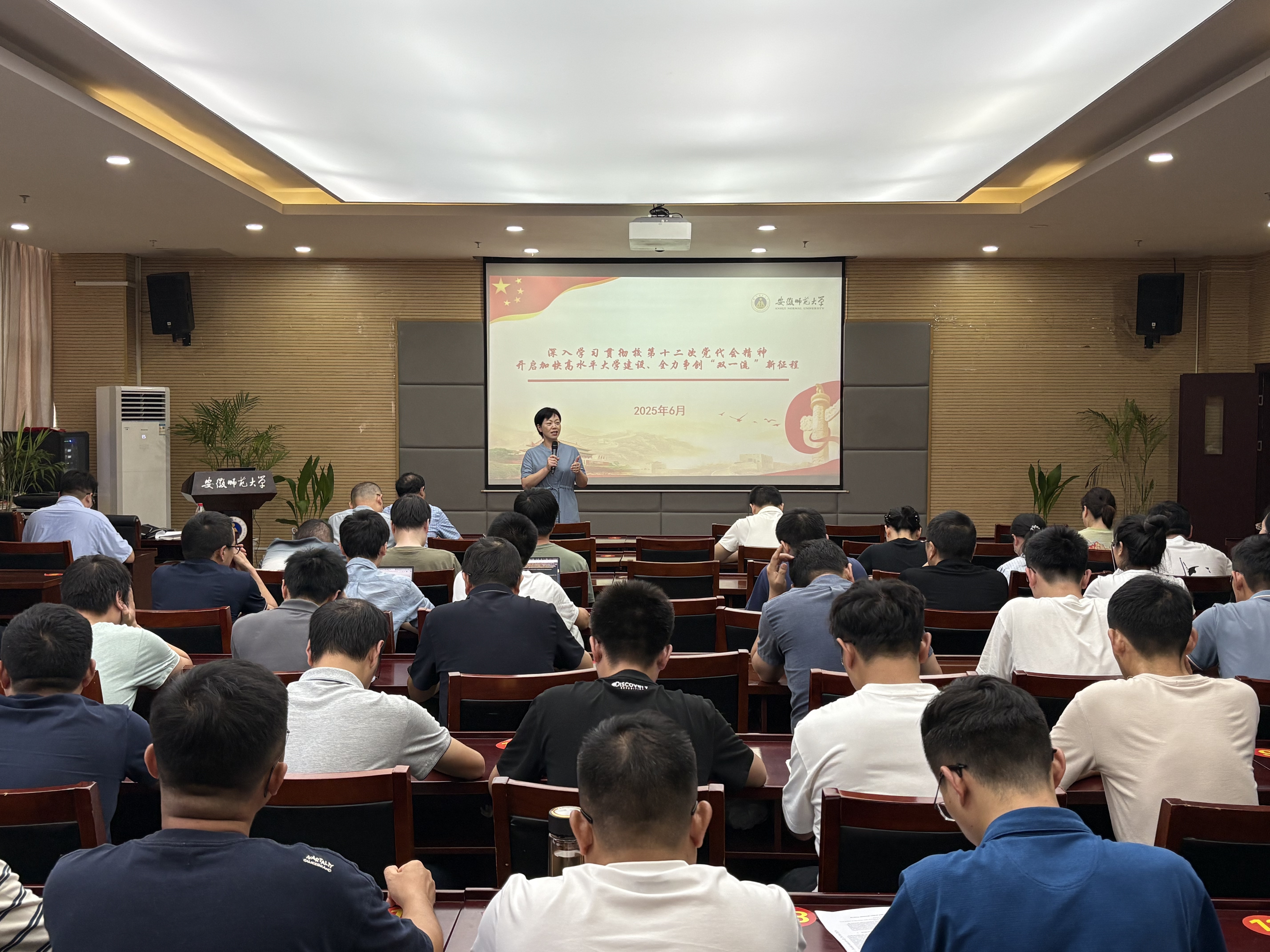 会上,宋静以《深入学习贯彻校第十二次党代会精神 开启加快高水平大学建设、全力争创“双一流”新征程》为题,从校第十二次党代会的定位、学校改革发展面临的新形势新要求、我们如何去做等方面向全院教职工集中传达了校第十二次党代会精神。各分管领导就留校学生教育管理、暑期小学期、初次就业率推进、学科竞赛准备、实验室安全、假期教职工出国境管理规定、科级干部调研摸底等工作进行布置。