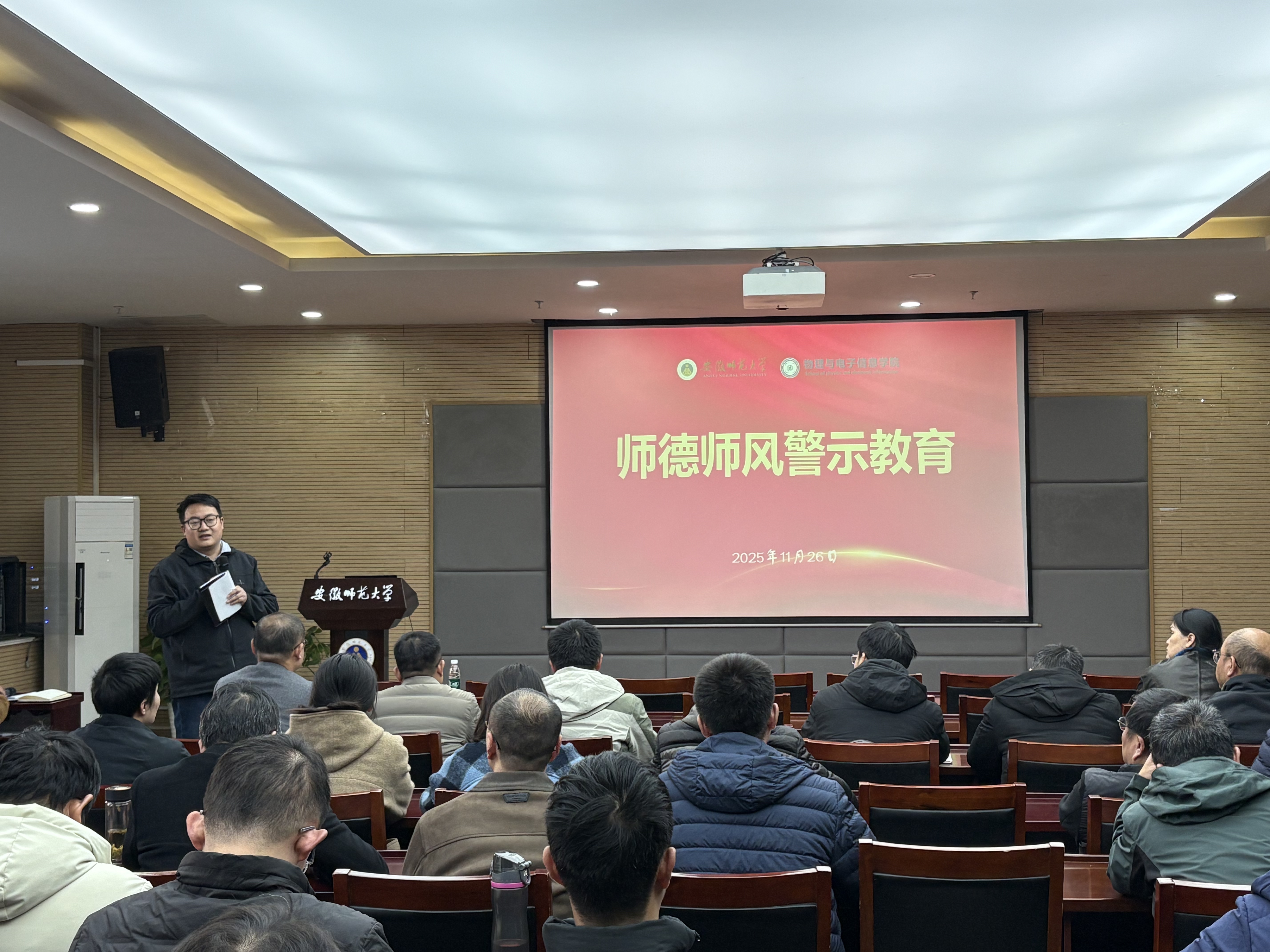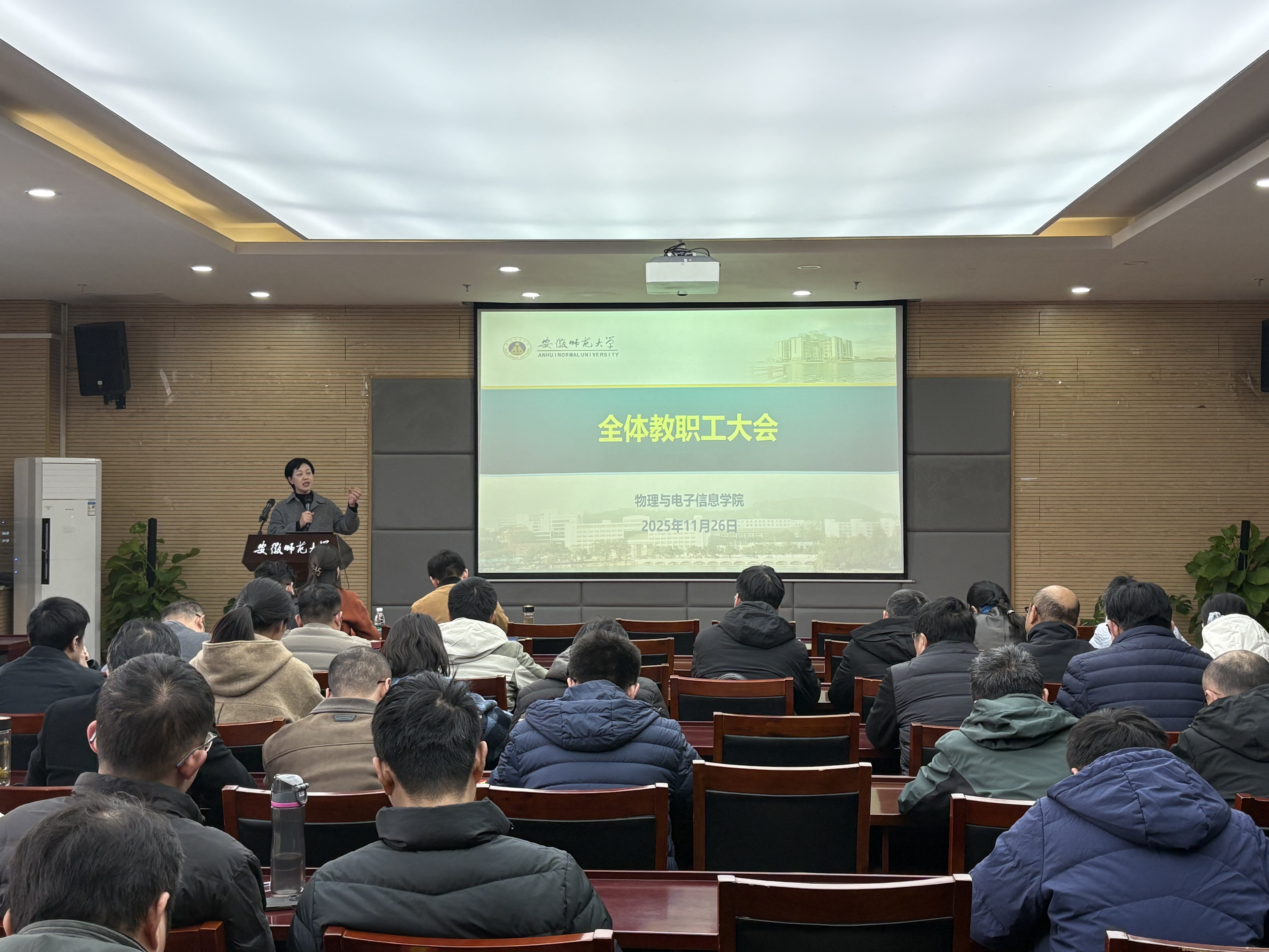 11月26日,免费足球直播app 在物理楼304会议室召开全体教职工大会,总结前期工作,布置近期重点工作,免费足球直播app 全体教职工参加会议,会议由免费足球直播app 党委书记宋静主持。会议邀请校审计处处长喻娜开展审计工作培训和师德师风警示教育。