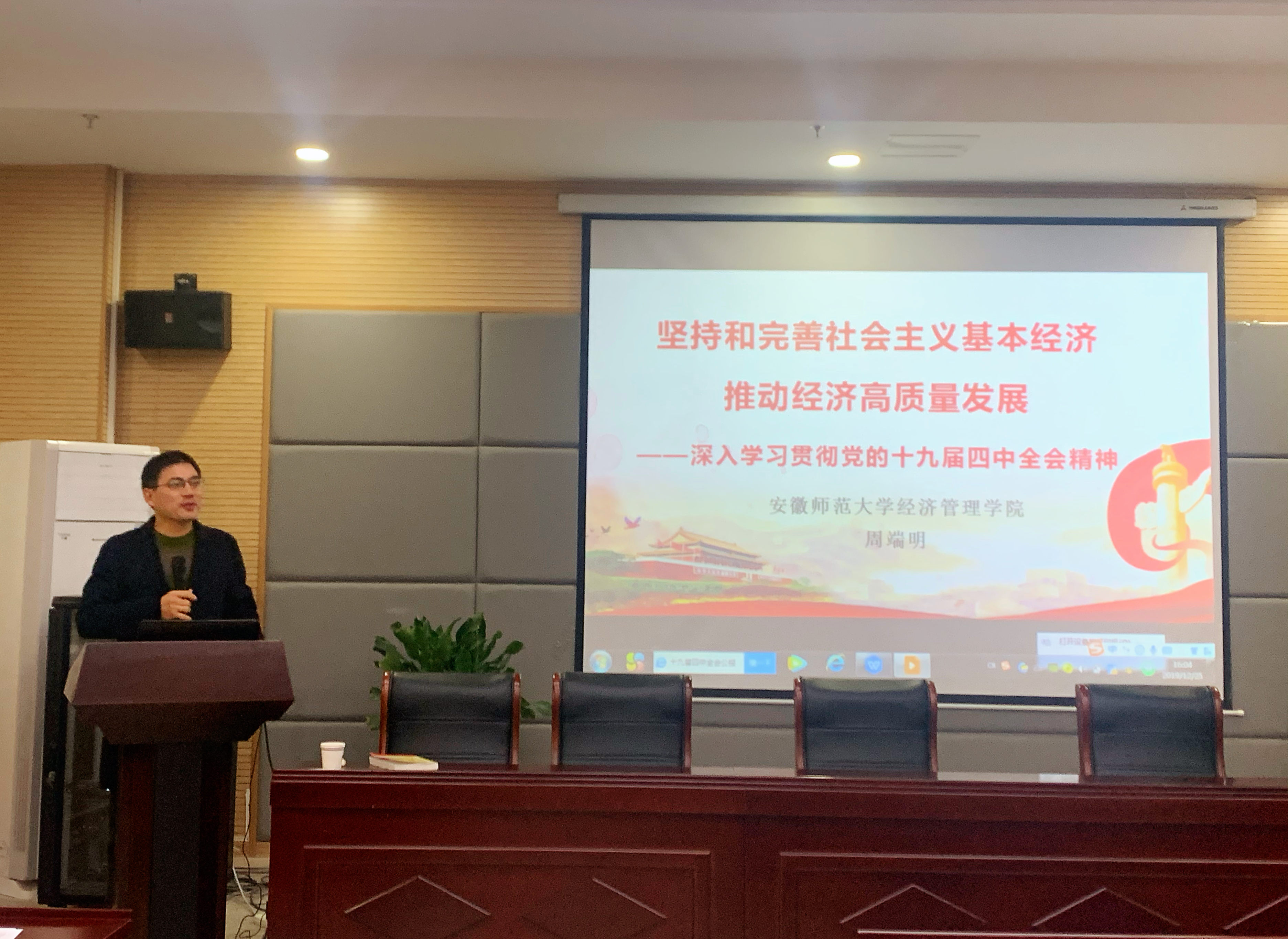 周端明简要介绍了十九届四中全会的基本情况和会议精神,并从坚持和完善中国特色社会主义制度、推进国家治理体系和治理能力现代化的重大意义;深刻领会中国特色社会主义制度和国家治理体系的显著优势,坚定中国特色社会主义制度自信;坚持和完善社会主义基本经济制度的重大意义;坚持和完善社会主义基本经济制度的主要内容四个方面展开宣讲。他强调,坚持和完善社会主义基本经济制度,是夯实新时代经济高质量发展的制度基础的必然要求。从内涵来看,社会主义基本经济制度由过去的“公有制为主体、多种所有制经济共同发展”演变为目前的“公有制为主体、多种所有制经济共同发展,按劳分配为主体、多种分配方式并存,社会主义市场经济体制等”,涵盖了所有制、分配方式、运行机制、资源配置等多方面内容。这一基本内涵的扩展,是把社会主义制度和市场经济有机结合起来、不断解放和发展社会生产力的客观需要,也是根据经济社会发展阶段不断适应调整、更好地发挥中国特色社会主义制度显著优势的内在要求。