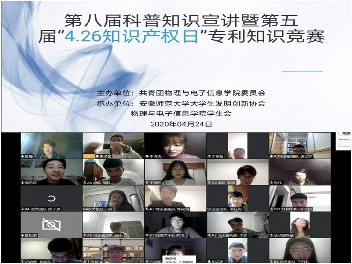 举办第五届“4.26知识产权日”专利知识线上竞赛,442名学生参加初赛答题,8支队伍成功晋级决赛。抢答环节中,每组四个队伍进行抢答,内容涵盖知识产权保护、青少年科普等。宣讲环节,各队伍以抽签顺序分为A、B组,分别就疫情防控和科学发展两大主题开展宣讲。队员们赛前充分准备、分工合理,展现出扎实的知识储备和积极向上的青年风貌。