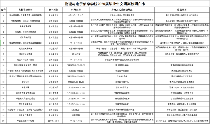 2020届毕业生文明离校明白卡》,张贴在每间学生宿舍,方便毕业生查阅参考。线上推送欢送毕业生专题:祝福视频、教师寄语、云毕业照等。院长郑贤锋深情寄语全体毕业生《格物穷理,在奋斗中点亮未来》。
