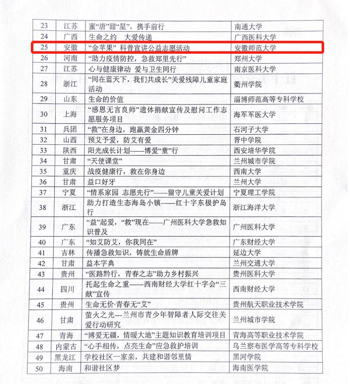 本网讯(免费足球直播app 刘冠琪 陈月)近日,中国红十字会总会公布2020年中国红十字青少年社会实践项目的评选结果函,全国共有50所高校获批立项,免费足球直播app-最快足球比分网 申报的《“金苹果”科普宣讲公益志愿服务行》项目成功获批立项,并获得专项资助。安徽省仅我校入选,这也是我校首次获批国家级红十字会社会实践项目。