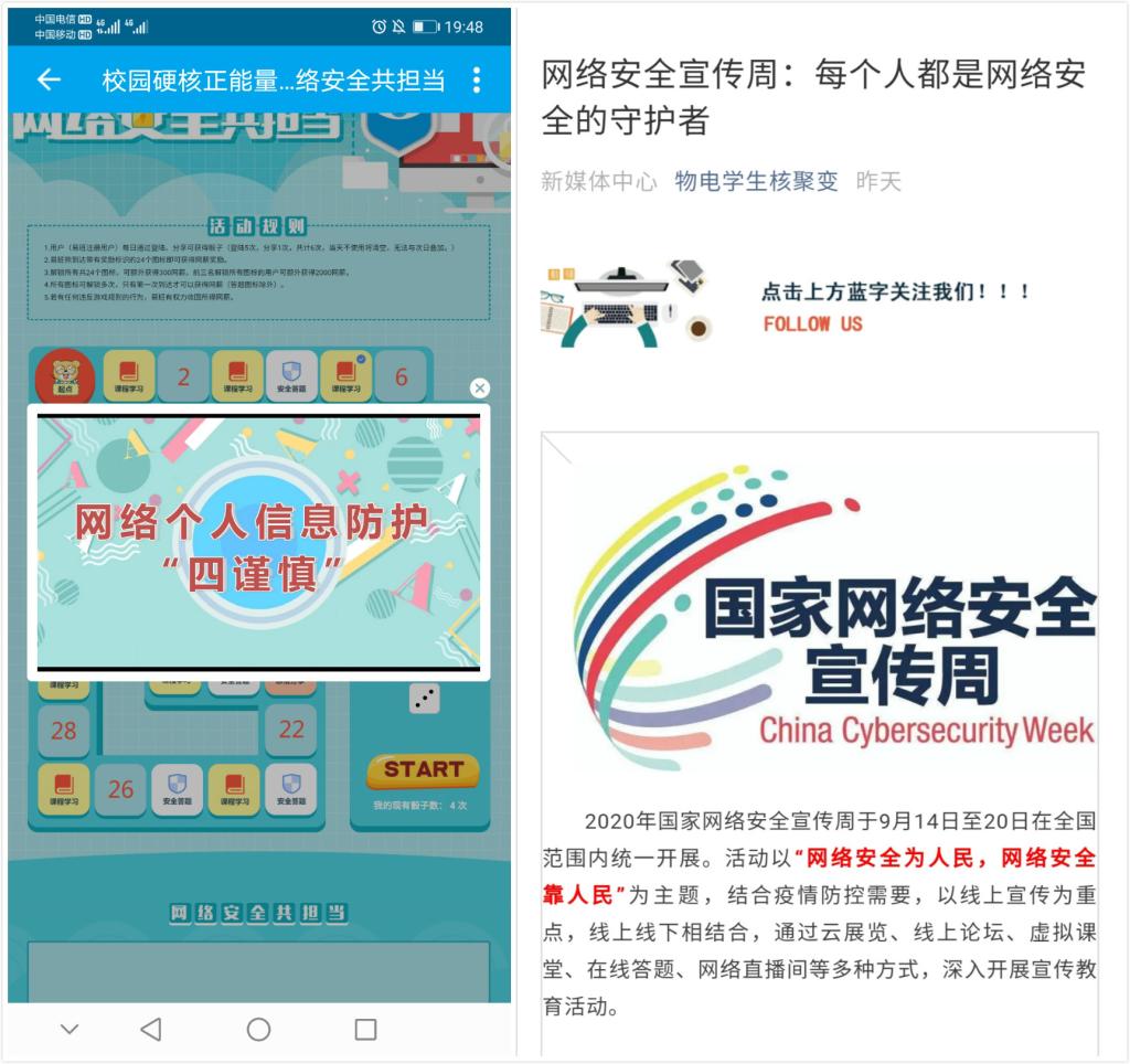 积极组织学生开展网络安全教育主题班会,通过班级群消息发布电子宣传页,普及基本的网络安全知识,积极引导学生参与全国大学生网络安全知识竞赛和“校园硬核正能量 网络安全共担当”游戏活动。