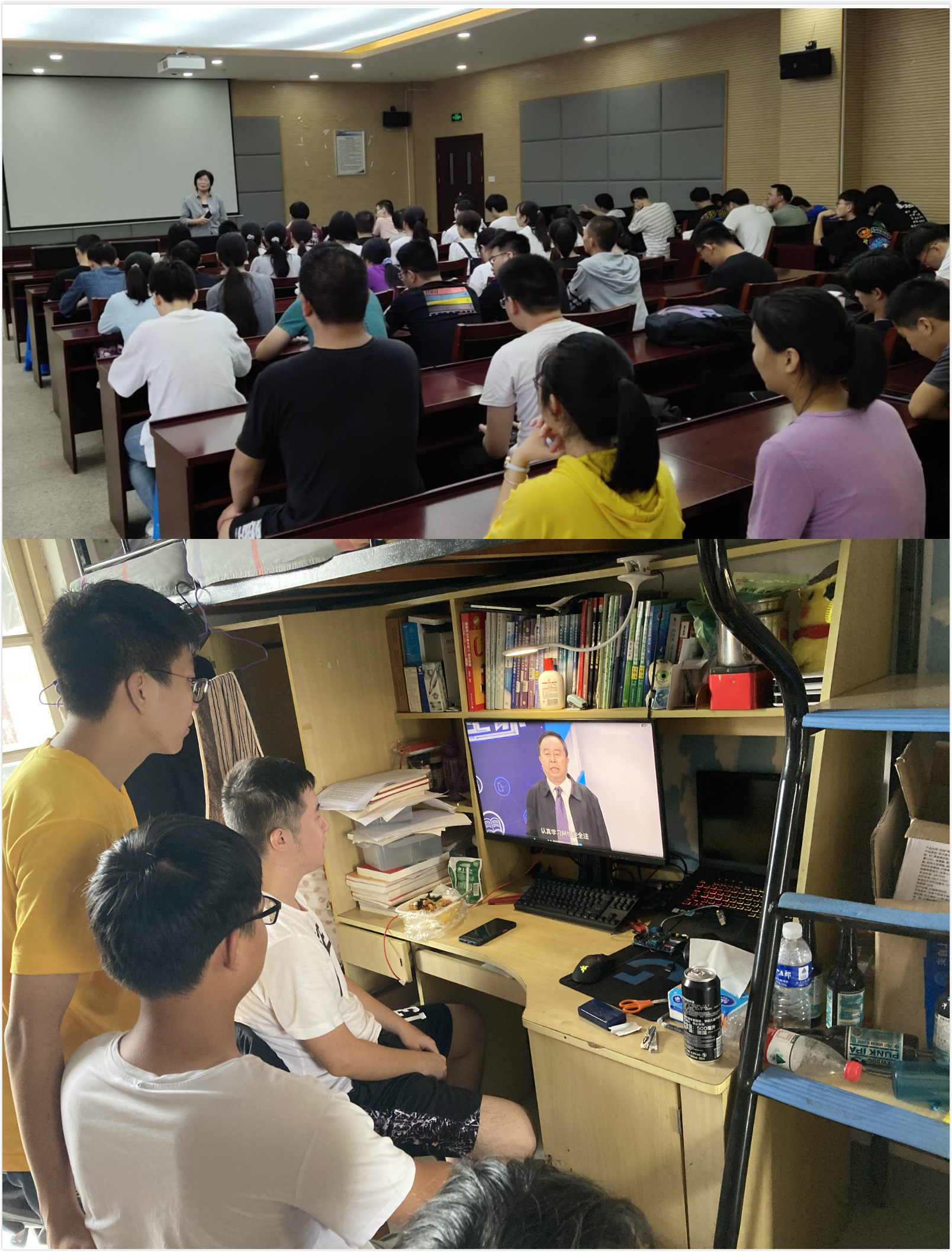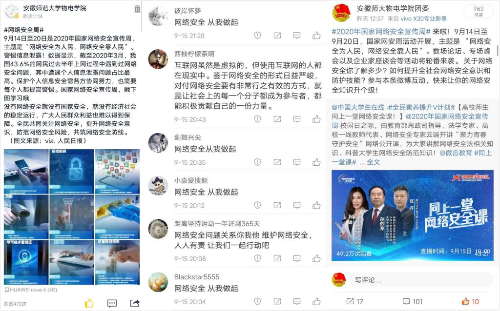 领导班子与同学们一起观看直播,观看结束后,院党委书记李娟和同学们就网络安全问题进行了交流,并提醒同学们要有网络安全意识,不要落入诈骗陷阱,人人成为网络安全的守护者。课后,院团委设置开展微话题,组织学生广泛参与线上讨论活动。