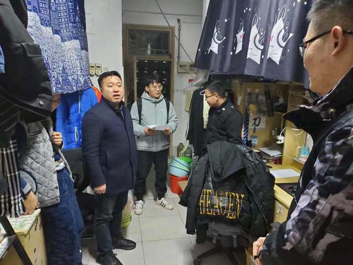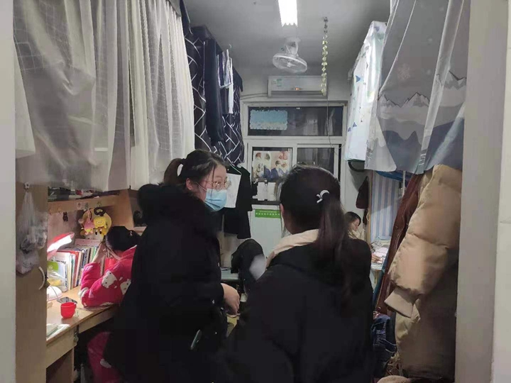 党委副书记黄友生带领全体辅导员深入学生宿舍,对宿舍安全隐患、寝室卫生、学生晚归情况等进行专项突击检查,重点检查是否存在晚归不归和使用违规电器等行为。针对部分宿舍卫生差、有杂物堆放的情况,督导学生立即整改、务实高效。同时临近期末,老师们叮嘱学生有计划、有准备地复习,严格遵守考试纪律。