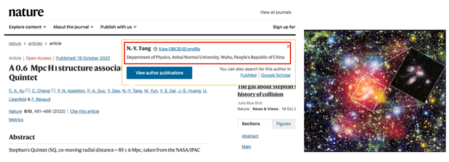 青年教师汤宁宇博士同相关国际研究团队合作,利用中国天眼(FAST,五百米口径球面射电望远镜)对著名致密星系群“斯蒂芬五星系”及周围天区的氢原子气体进行了成像观测,发现了1个尺度大约为2百万光年的巨大原子气体系统,比我们所在的银河系大20倍,对于研究星系及其在宇宙中的演化提出了挑战。相应成果发表在国际顶尖学术杂志《Nature》最新一期上(Nature, 610, 461(2022); 文章链接 //www.nature.com/articles/s41586-022-05206-x )。《Nature》杂志同期在线发表了题为“The gas about Stephan’s Quintet reveals a history of collision”的专题新闻报道。