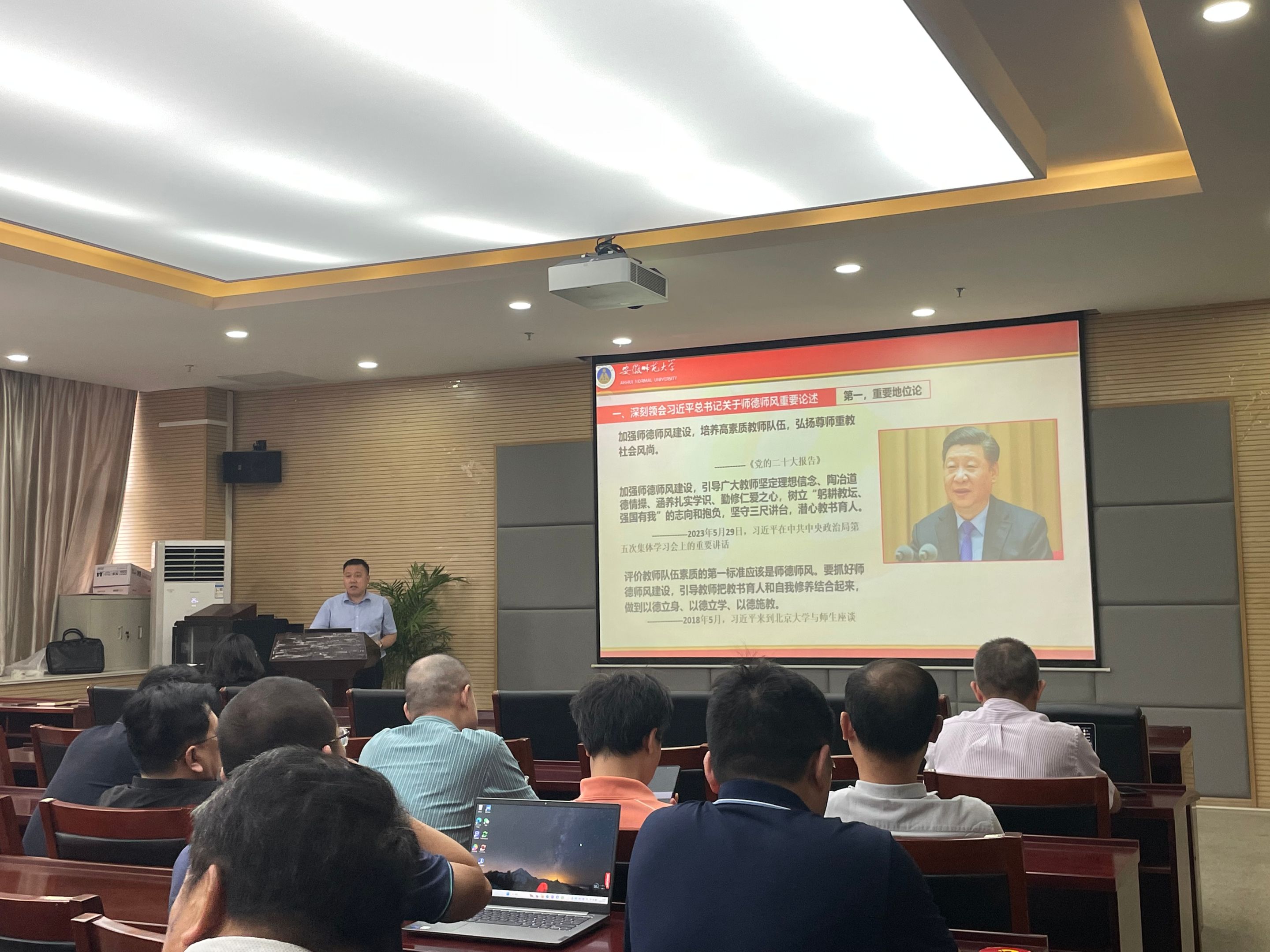 院党委副书记、纪委书记黄友生以《教书育人立师德,廉洁从教正师风》为题为全体教职工讲授师德师风专题党课,围绕“深刻领会习近平总书记关于新时代教师队伍师德师风重要论述”“当前师德师风可能存在的主要问题和廉政风险点”和“紧抓师德师风建设 为清廉学校增色添彩”三个方面层层展开,强调筑牢师德师风底线。教学副院长张爱清解读《安徽师范大学教学事故认定及处理办法》。