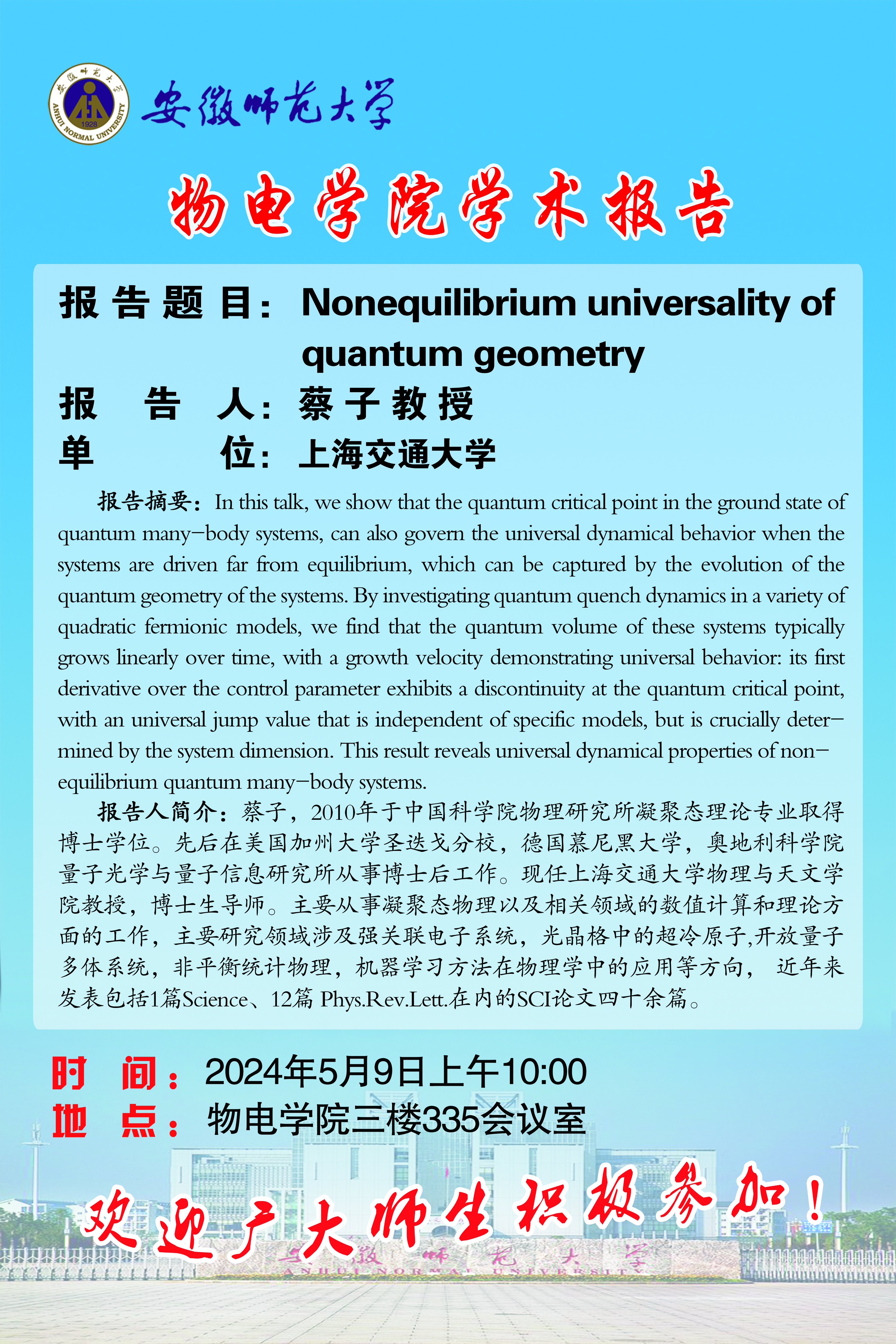 【学术预告】物电讲坛第21期:Nonequilibrium universality of quantum geometry