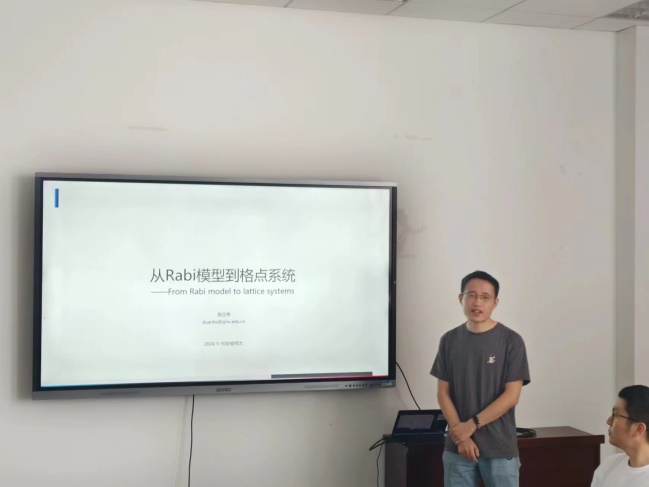 在报告会上,段立伟博士简要介绍了半经典Rabi模型与一维格点系统的相似性。Rabi模型是描述光与物质相互作用的最基本模型。取决于光场是否量子化,它通常分为半经典和量子Rabi模型两种形式。近年来,量子Rabi模型在理论和实验方面都取得重大突破,其中包括Fock-state lattice——将量子Rabi模型视为格点系统,研究量子化光场的拓扑态等物理性质。早期研究表明,当引入恒定外力时,电子在一维链中可以做周期性振荡,即布洛赫振荡。基于半经典Rabi模型与恒定外力下一维链系统的相似性,可以预测,通过调整适当参数,电子可以实现在相距较远的两个格点之间周期跳跃,而非相邻格点之间连续的跃迁。该研究为探索凝聚态物理和量子光学的联系提供了新的思路。报告会结束后,与会师生和段立伟博士就相关问题展开了热烈的讨论和交流。