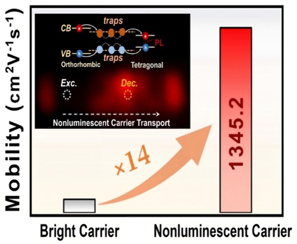 大连化学物理研究所金盛烨研究员团队合作,在钙钛矿半导体载流子输运机制研究中取得重要进展。联合攻关团队利用自主设计搭建的原位温控-超快荧光动力学显微成像系统,揭示了甲胺铅碘(MAPbI3)单晶纳米线在低温条件下由相变诱导缺陷引起的非辐射态载流子长距离输运机制,并据此实现了高效的光电探测功能。研究发现,在零下130摄氏度的相变临界温度条件下, MAPbI3处于正交相和四方相两种晶相共存的状态,巨大的结构应力导致其晶格产生大量的相变诱导缺陷。这些相变诱导缺陷不仅并未阻碍载流子输运,反而可以捕获并“保护”载流子免受辐射复合和非辐射复合的影响,形成一种长寿命的非辐射态,使载流子迁移率得到显著提升(1345.2 cm⟡V⁻¹s⁻¹),达到室温下自由载流子迁移率的14倍之多。基于这一特性,研究团队利用MAPbI3单晶纳米线构建了高灵敏度的微纳光电探测器,将光响应度提高了3倍。