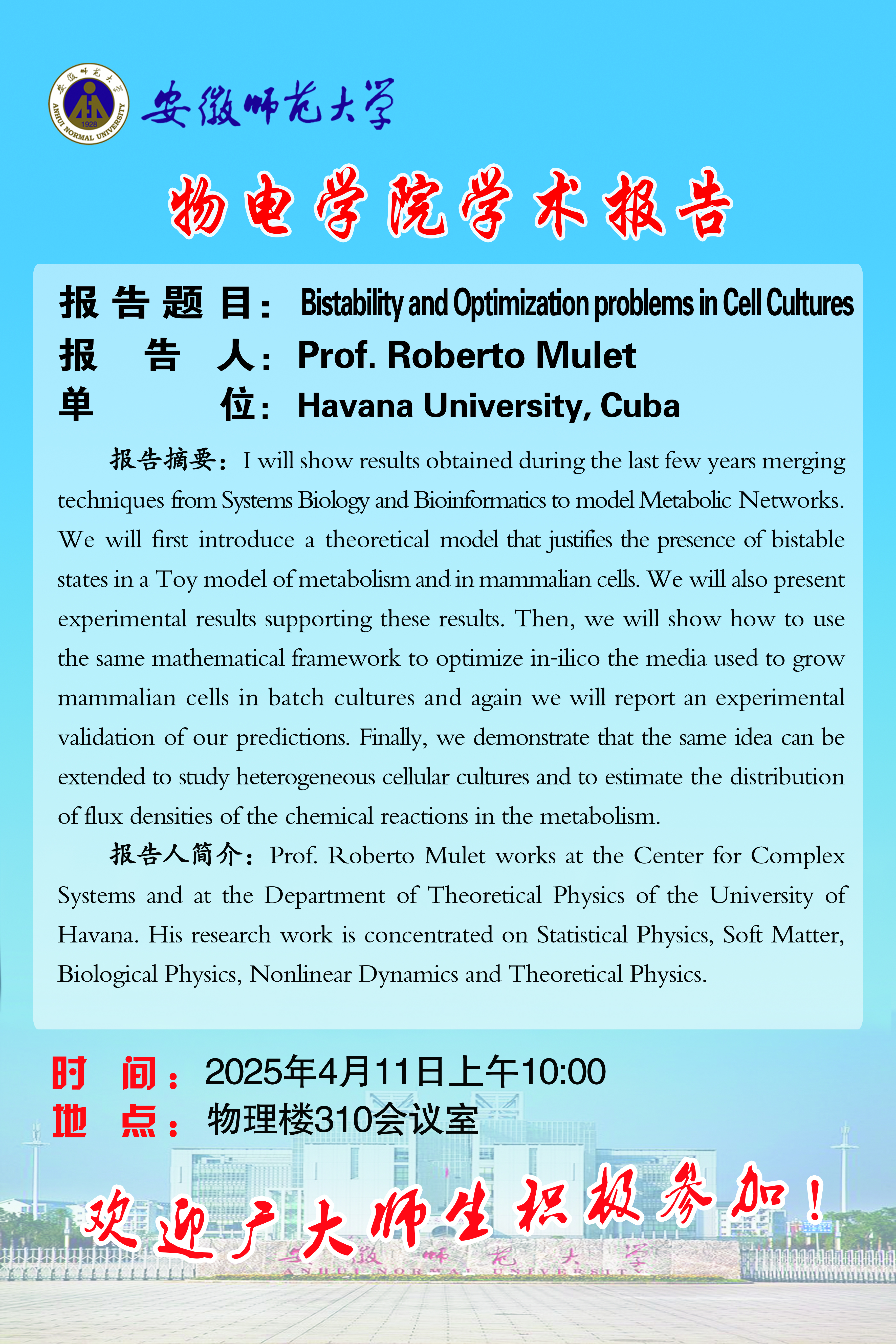 【学术预告】物电讲坛2025年第12期:Bistability and Optimization problems in Cell Cultures