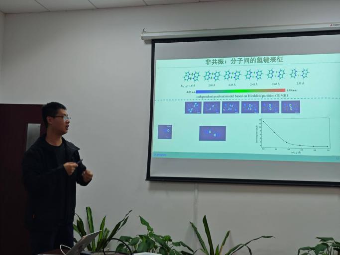 在报告中,谢震首先介绍了拉曼散射在分子振动与电子态探测等领域的重要应用。基于超高局域光场下分子的拉曼散射,其光学成像具有了对单子分子激发态和振动的表征能力。随后,他进一步介绍,为充分发挥该技术的潜力,发展与之匹配的理论计算与模拟方法至关重要,这不仅有助于理解光场-分子相互作用的微观机制,也将推动局域光场拉曼技术在材料与化学表征中的新应用。研究团队已在理论上提出创新策略,通过实空间光学成像手段揭示了分子间激发态相互作用及氢键作用,为在纳米尺度探究分子开辟了新路径。报告结束后,与会师生围绕相关议题与谢震展开了深入交流与讨论。