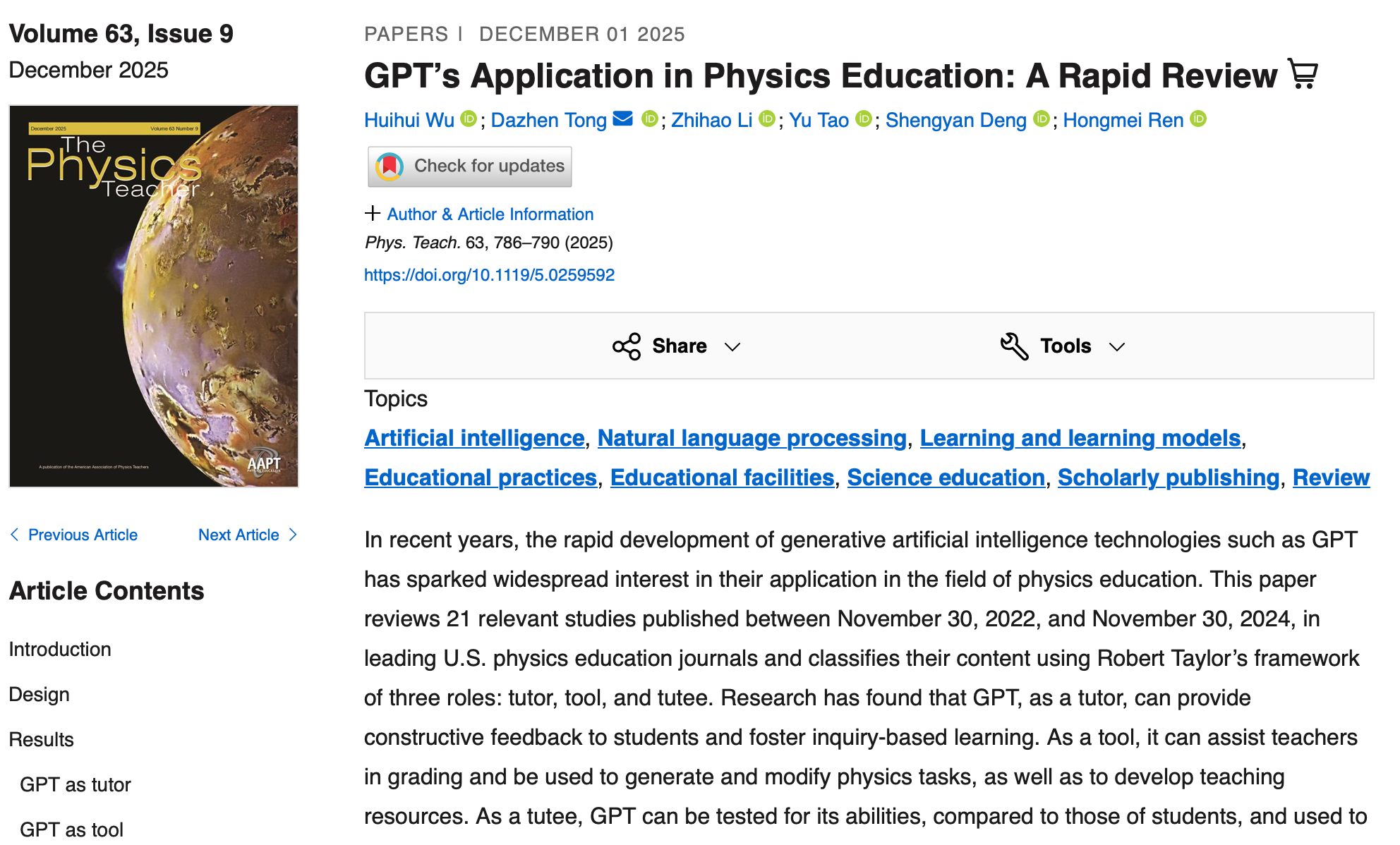 《The Physics Teacher》是美国物理教师协会(AAPT)出版的知名物理教学实践类期刊,被SCI收录,在国际物理教育领域具有重要影响力。