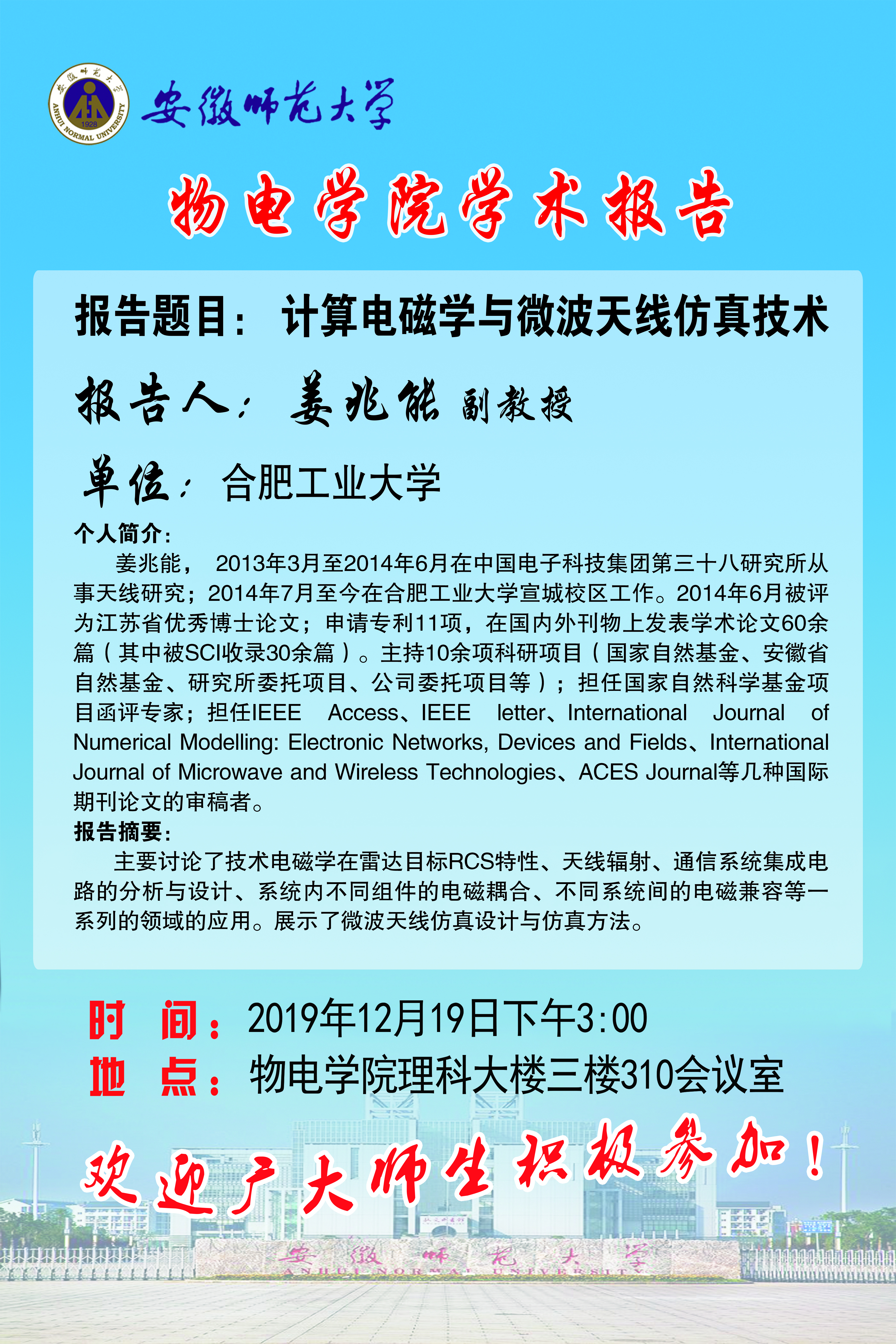 地址:花津校区-安徽省芜湖市九华南路189号 邮编:241000 电话:0553--3869894