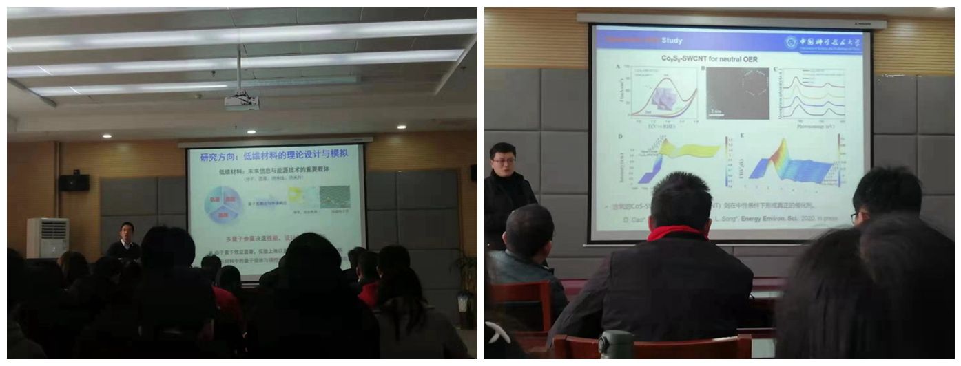 在本次报告会上,宋礼教授首先介绍了同步辐射光源的主要特点和发展历程,随后详细讲述了在工况条件下利用多种同步辐射谱学技术研究电催化机理的重要进展,并以缺陷态比例较高的α-Ni(OH)2、Ir- Co(OH)2界面、不饱和Co(OH)3Cl和不同pH条件下的类变色龙Co9S8四种典型体系为例,重点讨论了催化剂在电催化反应中的结构重构现象。随后,武晓君教授介绍了低维非金属纳米光解水催化材料的理论设计与模拟研究新进展。在比较了过渡金属离子组成的无机半导体全光解水材料、负载助催化剂、以及无机异质结半导体催化材料的优缺点之后,武晓君教授重点阐述了一类基于炔基的非金属共价有机框架化合物(covalent organic framework, COF)在全分解水制备氢气与氧气方面的优势,介绍了利用理论模拟揭示其光解水机理的最新成果。此外,武晓君教授还和与会师生分享了他在利用大数据分析与机器学习对催化功能进行有效筛选与预测方面的工作进展,提出了基于分子单体设计新的COF光催化材料的解决方案。报告会结束后,与会的各位老师和同学就自己关心的问题与宋礼教授和武晓君教授展开了热烈讨论和详细交流。