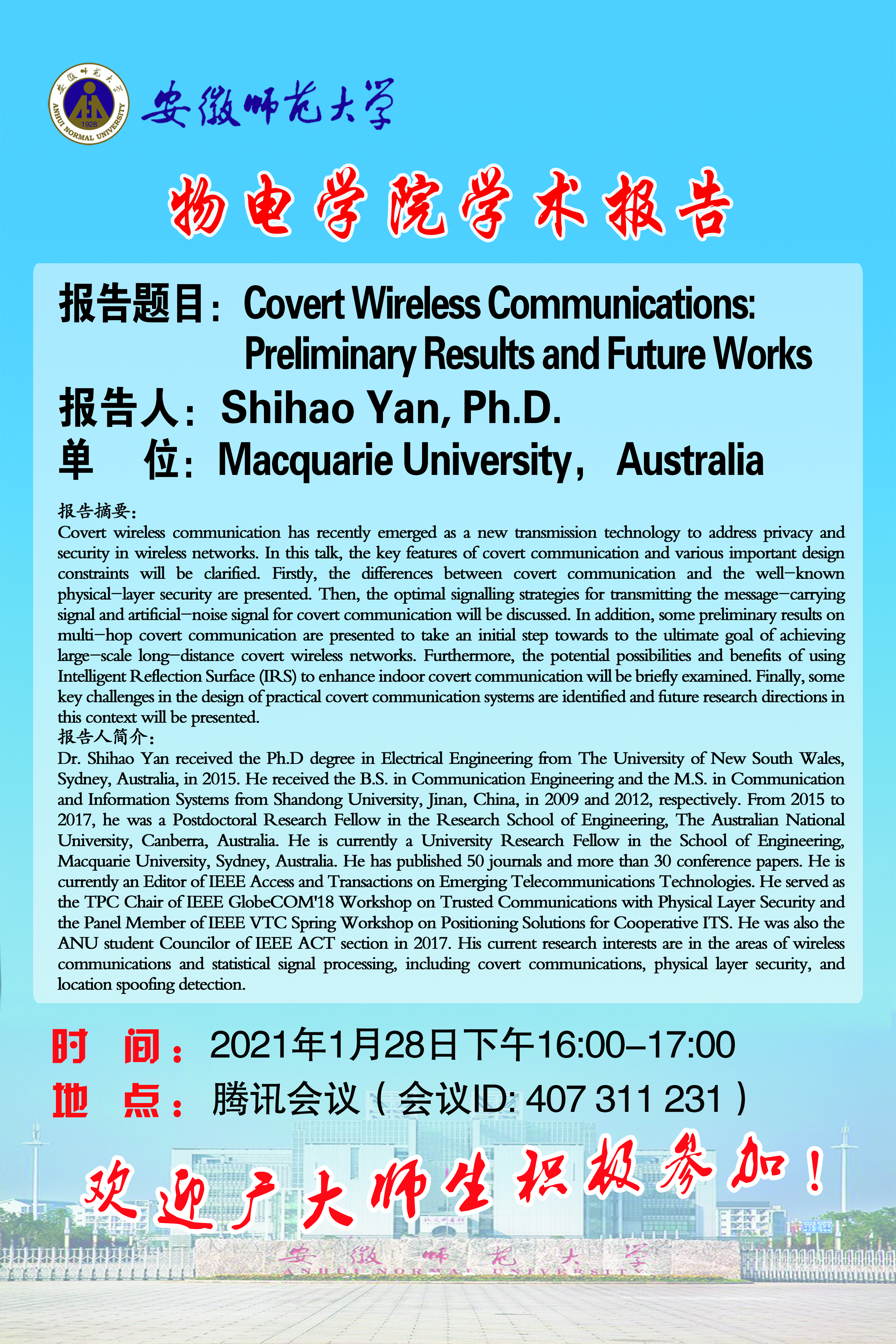 【学术预告】Shihao Yan, Ph.D:Covert Wireless Communications: Preliminary Results and Future Works