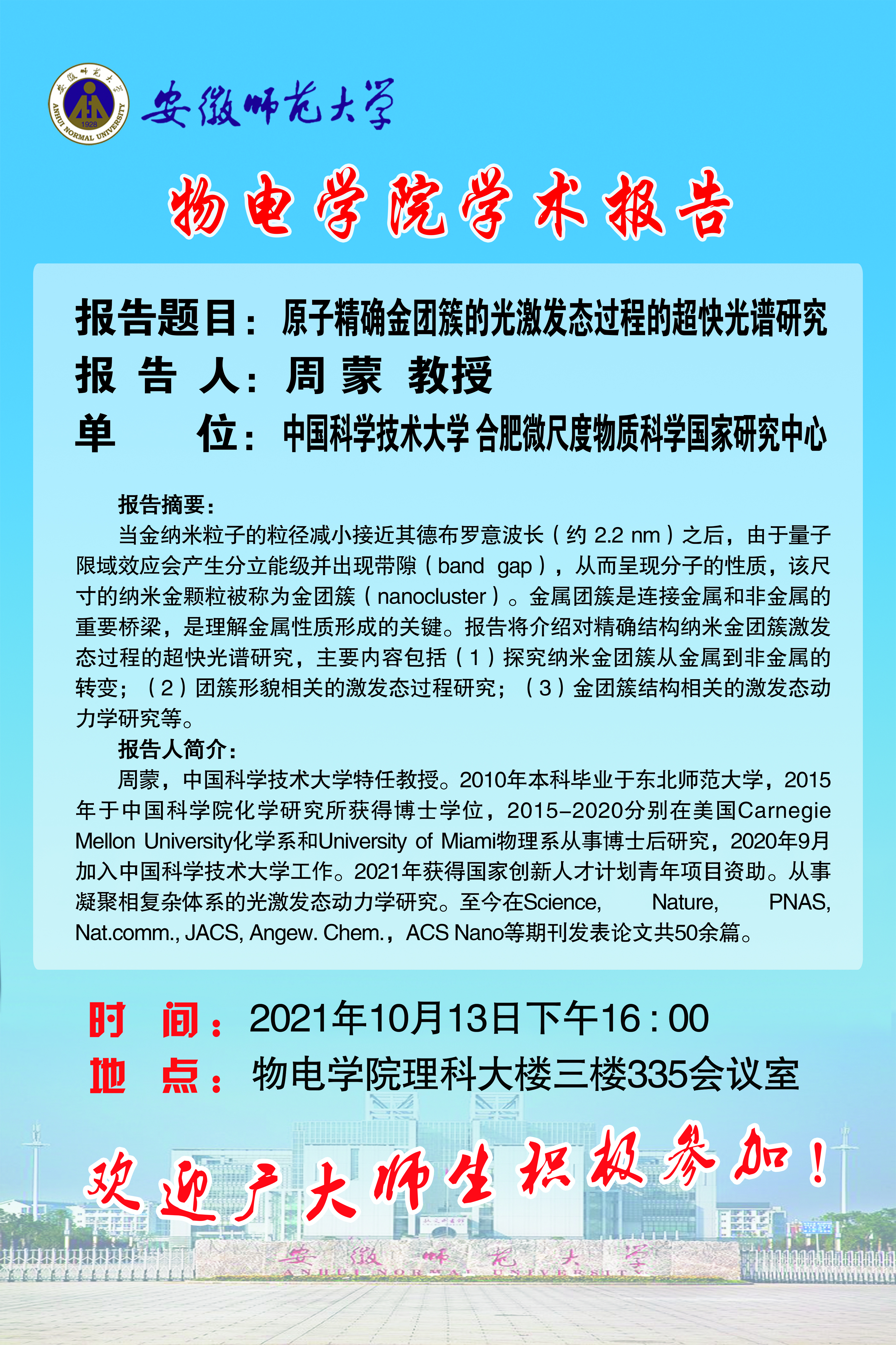 【学术预告】周蒙:原子精确金团簇的光激发态过程的超快光谱研究