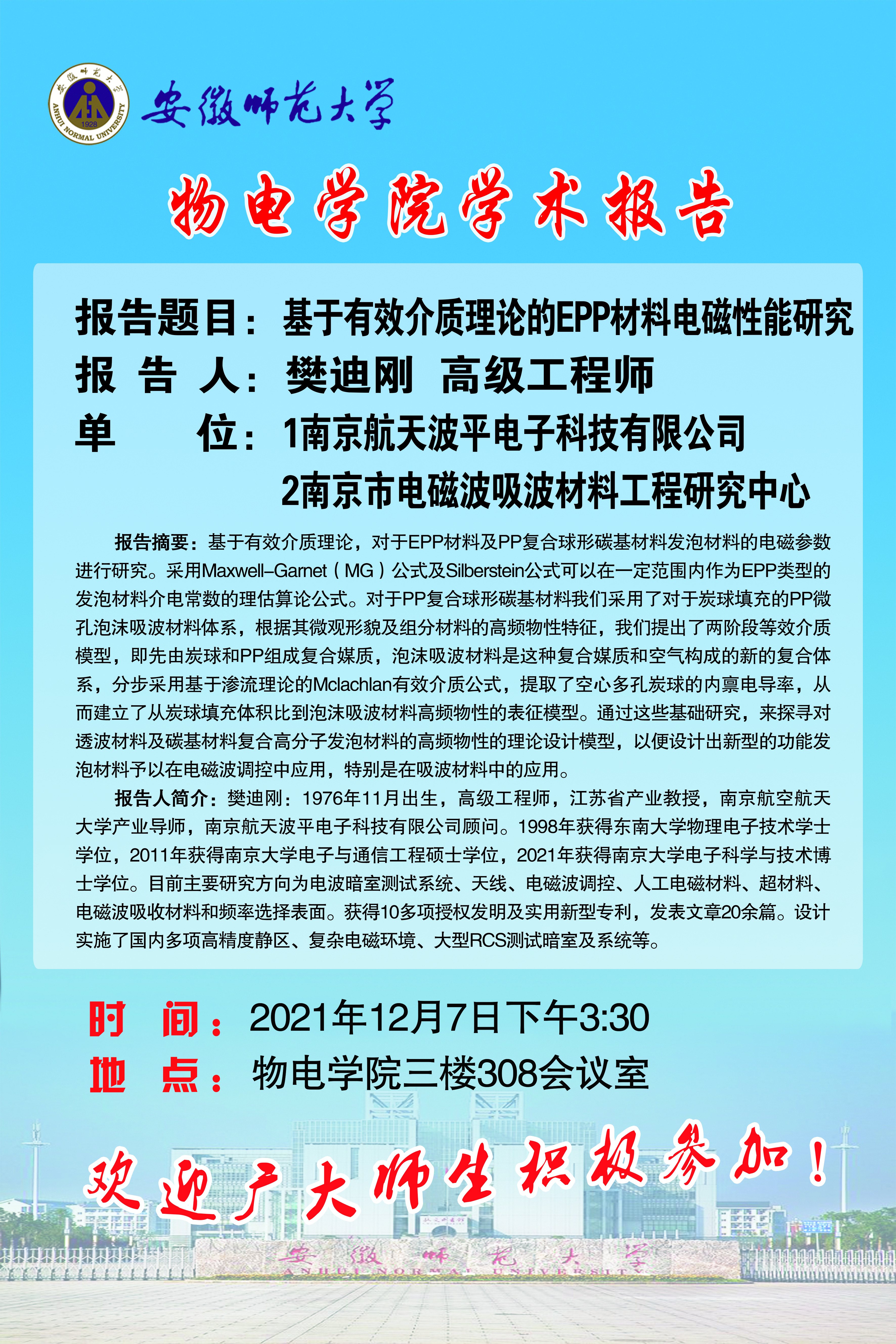 【学术预告】樊迪刚:基于有效介质理论的EPP材料电磁性能研究