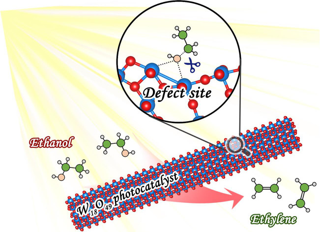 近日,我校熊宇杰教授与陆洲教授展开合作研究,采用具有大量晶格缺陷的非化学计量氧化钨W18O49纳米线作为光催化剂,通过光催化醇类脱水直接生成烯烃。以乙醇脱水为例,在紫外+可见+红外的全光谱光照条件下,在220°C即可实现275.5 mmol∙g∙cat-1∙h-1的乙烯生成速率,并具有高达99.9%的优异选择性。在此基础上,结合超快瞬态吸收光谱与原位X射线光电子能谱技术,深入研究了其中的光催化机理,发现缺陷氧化钨半导体中的带间和带内跃迁的协同作用对反应性能的促进及反应转化具有重要作用。