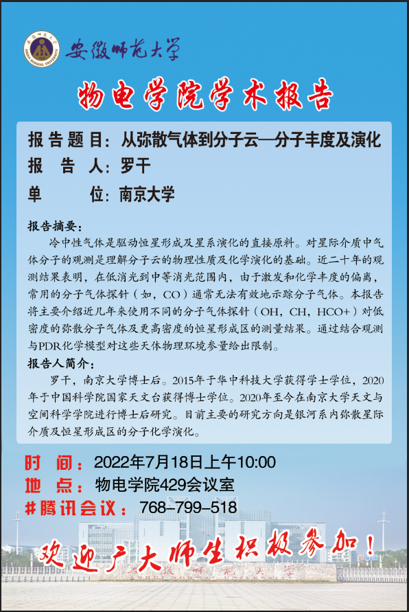 【学术预告·物电讲坛】罗干:从弥散气体到分子云——分子丰度及演化