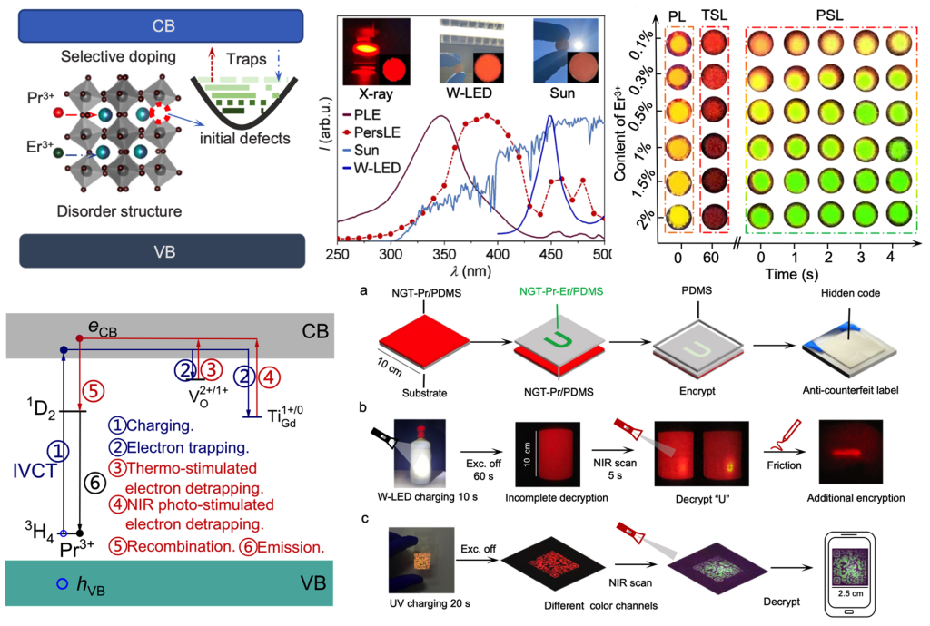 宁利新教授与华南理工大学夏志国教授团队合作,设计利用掺杂稀土离子丰富电子能级及荧光发射特征与基质材料合适缺陷能级特性,在NaGdTi2O6:Pr3+, Er3+荧光材料中实现了五种激励模式的光发射。在各种外激励作用下,包括从X射线到近红外的光激励、热激励、以及力激励,可以实现静态和动态强光发射;基于第一性原理计算,识别了主要相关缺陷并厘清了动态发光机理;设计演示了该材料在荧光防伪技术中的应用。相关研究成果近日已发表在国际著名期刊《自然•通讯》上,标题为“Interplay of defect levels and rare earth emission centers in multimode luminescent phosphors(Nature Communications, 13:7589 (2022), //doi.org/10.1038/s41467-022-35366-3)。另外,本工作被杂志编辑分别选为“无机与物理化学”和“材料科学与化学”领域的亮点文章。(Editors’ Highlights, //www.nature.com/collections/wtpqpqpgwd, //www.nature.com/collections/eecgdgijhh)