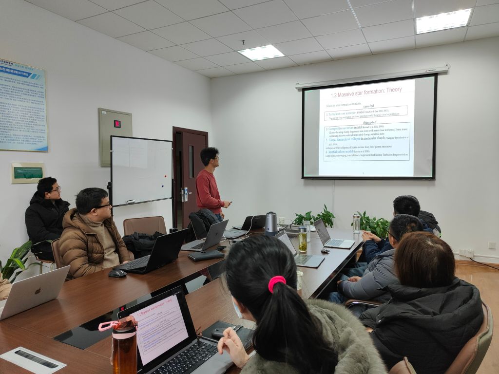 报告会上,李尚活博士首先介绍了大质量恒星及星团的反馈如辐射,星风以及超新星爆炸等机制对于星系演化的重要作用。目前对于大质量恒星及星团在早期的形成及演化阶段仍然缺少足够的了解。致密的大质量红外暗云被认为是大质量恒星形成的场所,能够提供大质量恒星形成早期的环境。李博士介绍了他利用ALMA、VLA、SMA、IRAM等红外及亚毫米望远镜对红外暗云进行的一系列工作。这些研究工作提升了对于大质量原初恒星在早期演化条件的理解。在这个报告中,李博士展示了在0.01pc的小尺度的原初恒星及云核中的动力学结果,比如湍流、外流、吸积等物理过程,以及演化中的化学特性。报告会结束后,与会师生就相关问题同李尚活博士展开了热烈讨论和交流。