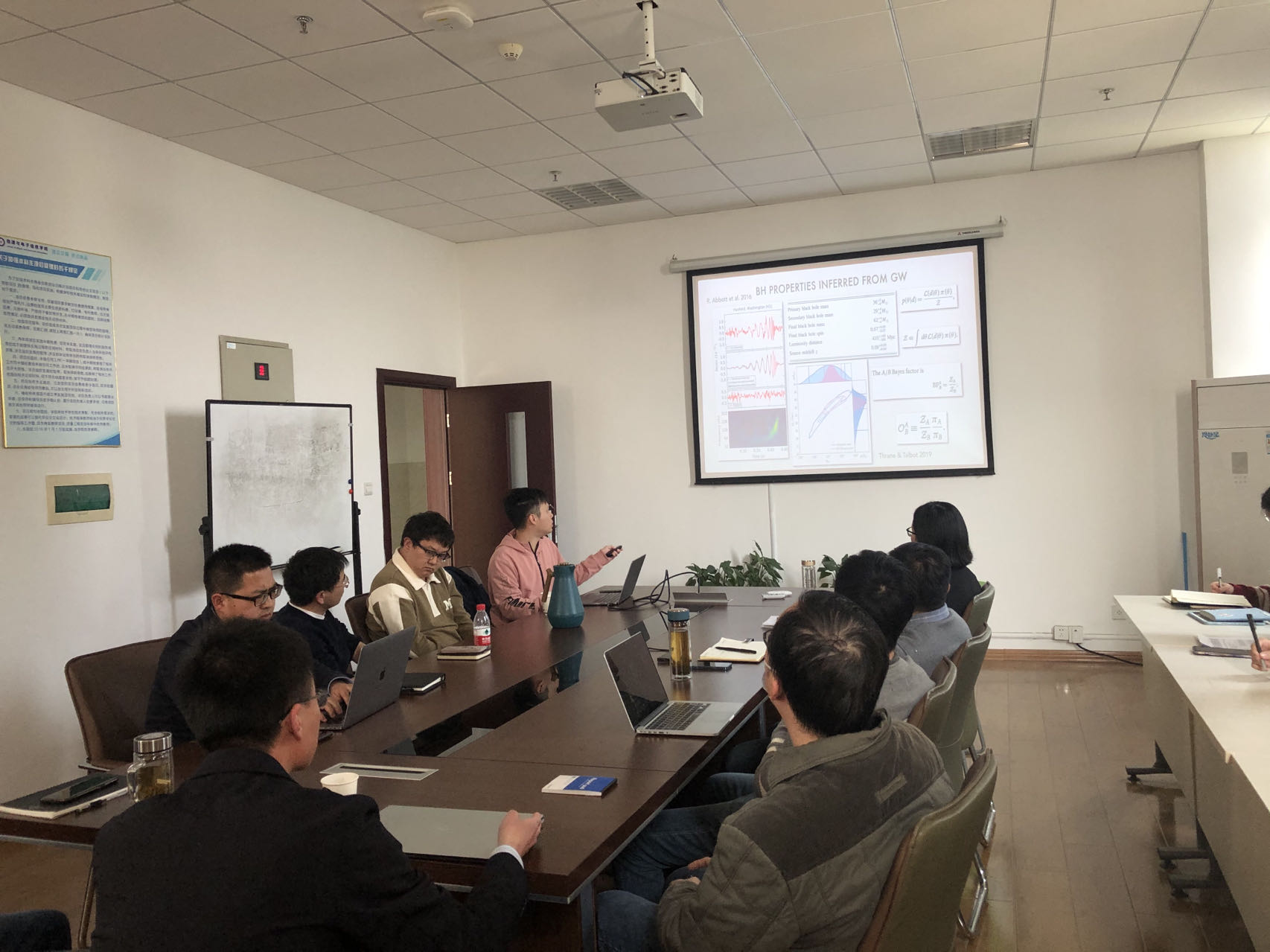 报告会上,王远瞩博士介绍了最新的激光干涉引力波探测网络(LIGO/Virgo/KAGRA)对双黑洞的最新探测。至今,人们通过引力波探测已经发现超过90个双黑洞并合事件的候选体,我们得以从这些事件的观测数据中推断出它们的质量、自旋、距离等重要信息。然而,科学界对于这些事件的起源和演化还没有统一的答案,所提出的猜想包括恒星演化、多次并合原初黑洞等。在这次报告中,报告人介绍一些该领域内为了探索双黑洞形成渠道所做的不同尝试,其中包括利用不同先验信息对单个事件进行推断,以及在分布中寻找不同渠道留下的统计特征等。报告会结束后,与会师生就相关问题同王远瞩博士展开了热烈讨论和交流。