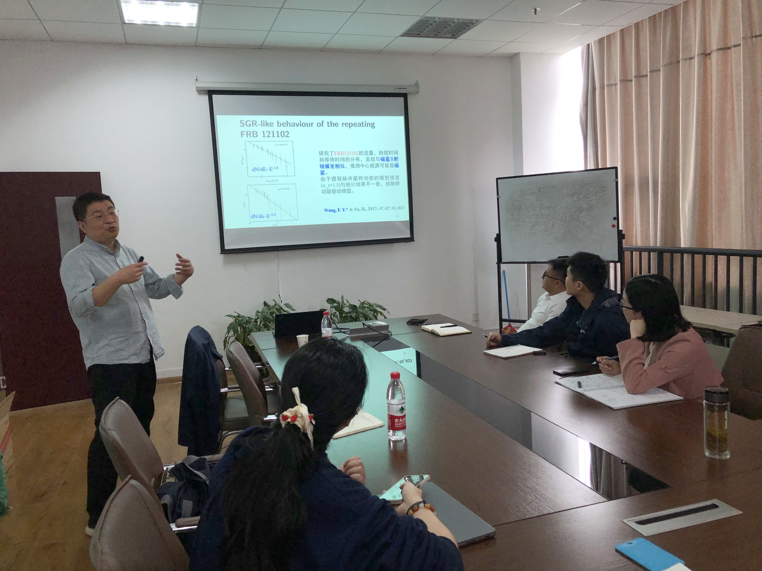 报告会上,王发印教授简要介绍了快速射电暴的研究背景,它是一种来自宇宙深处的射电爆发现象,它持续时间短,却极其明亮,在几毫秒的时间内释放的能量超过太阳在一个月内释放的总能量。自2007年发现以来,其起源、分类、辐射机制和周围环境一直是未解之谜,是天文学的最前沿研究领域之一。随后,王教授从观测性质、物理模型、统计性质和宇宙学应用等方面讲述了快速射电暴的最新研究进展。与此同时,王教授同与会师生分享了课题组在快速射电暴研究中取得的进展,相关研究成果提出的法拉第旋转量(Faraday rotation measure,简称RM)演化的新模型为解释快速射电暴的起源提供了重要线索,该模型还可以解释最新发现的其它三个快速射电暴(FRB 20190520B,FRB 20180916B和FRB 20220529)的RM演化,表明一部分快速射电暴起源于双星系统。观测发现银河系内的双星系统PSR B1744-24A的RM和圆偏振演化与FRB 20201124A相似,证实了该模型。报告会结束后,与会师生就相关问题同王发印教授展开了热烈讨论和交流。