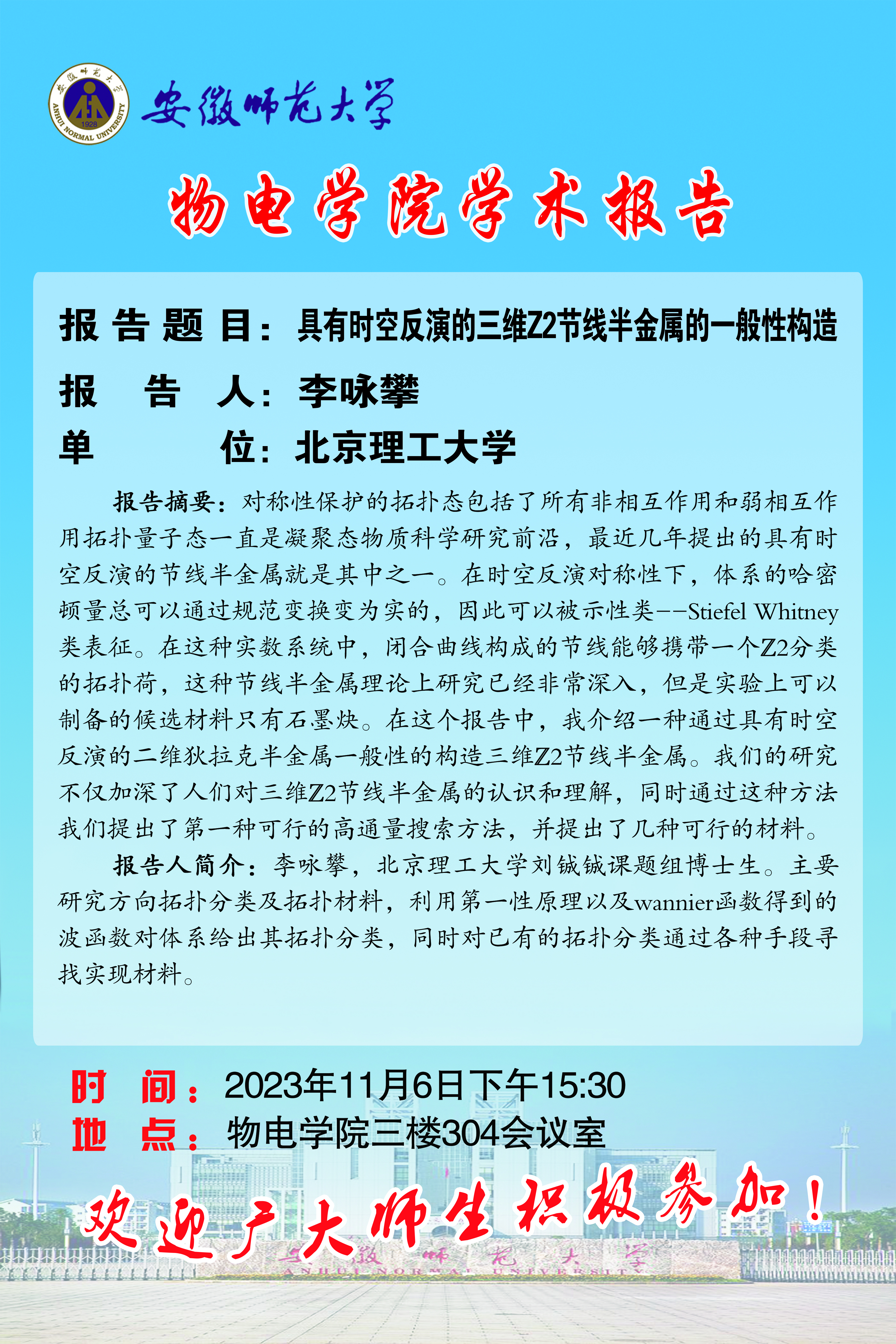 【学术预告·物电讲坛】李咏攀:具有时空反演的三维Z2节线半金属的一般性构造