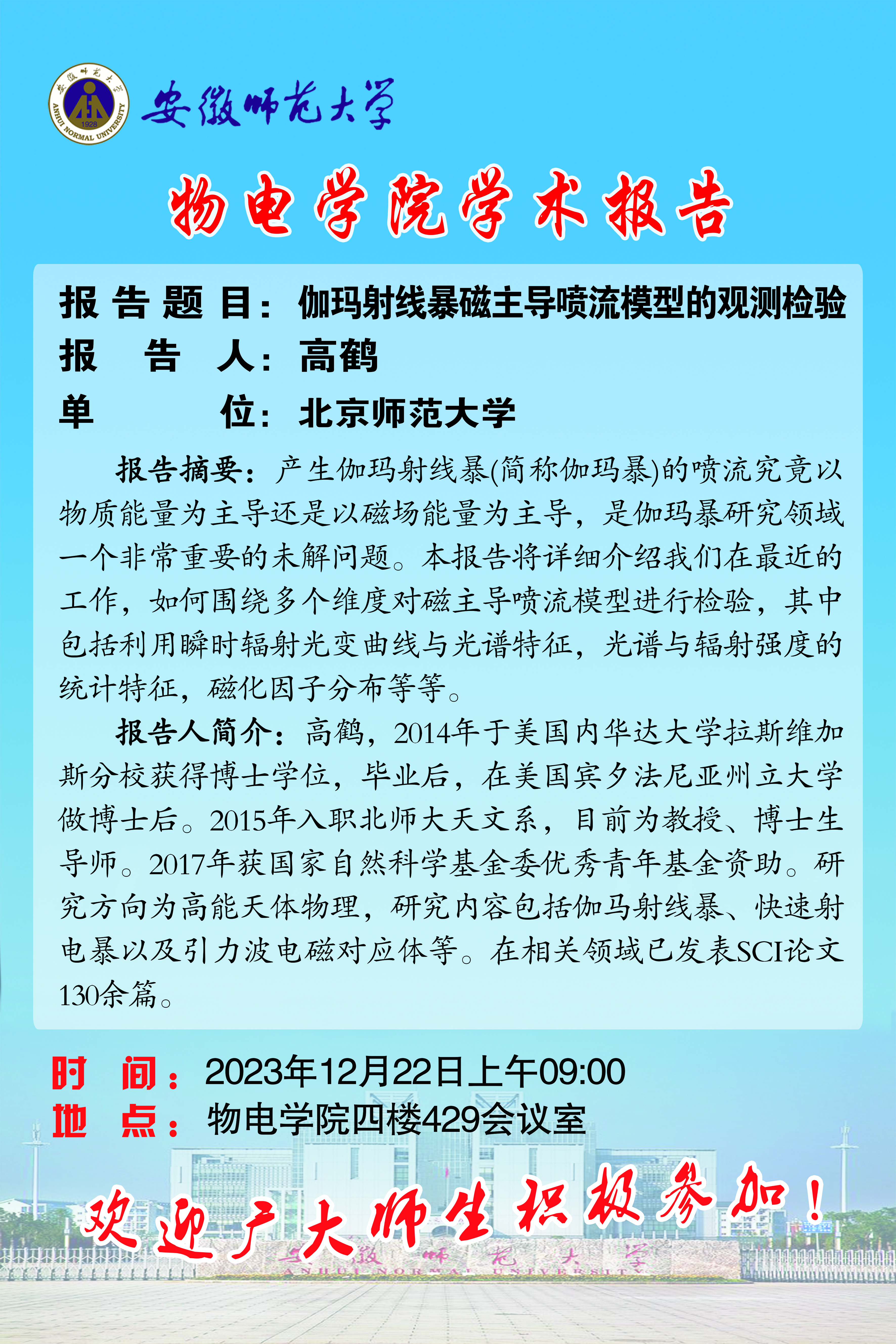 【学术预告】物电讲坛第48期:伽玛射线暴磁主导喷流模型的观测检验