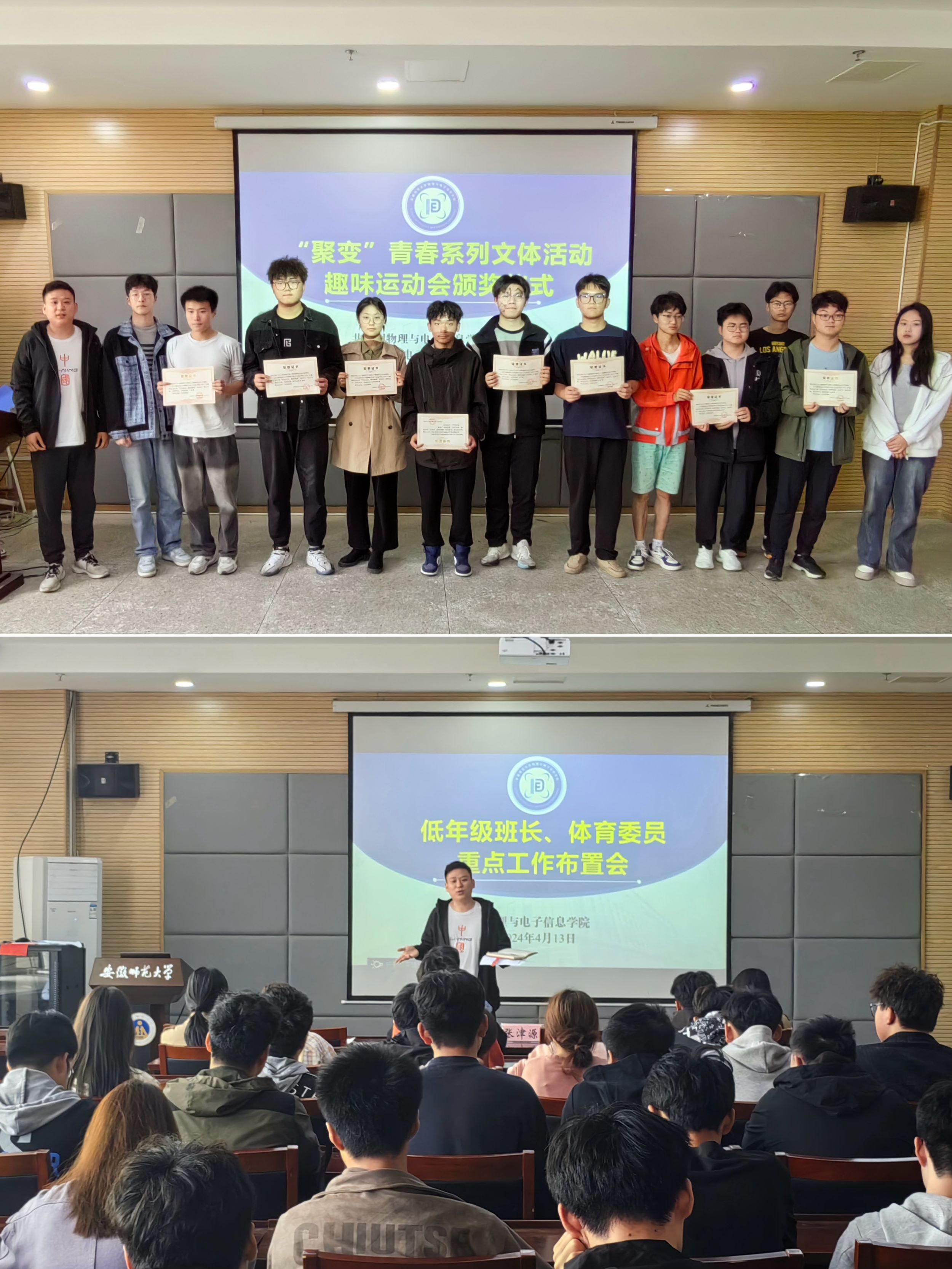 比赛设置有拔河、九人十足、袋鼠跳接力、单足跳接力等集体趣味性项目,比赛中,大家全力以赴、团结合作,共同为班级的胜利努力,现场气氛热烈浓郁,加油助威声音齐放。经过激烈的角逐,23级物理学3班获得一等奖、23级物理学1班等班级获得二等奖、23级电子信息工程1班等班级获得三等奖、23级物理学3班获得最佳组织奖、23级通信工程1班等班级获得体育道德风尚奖。