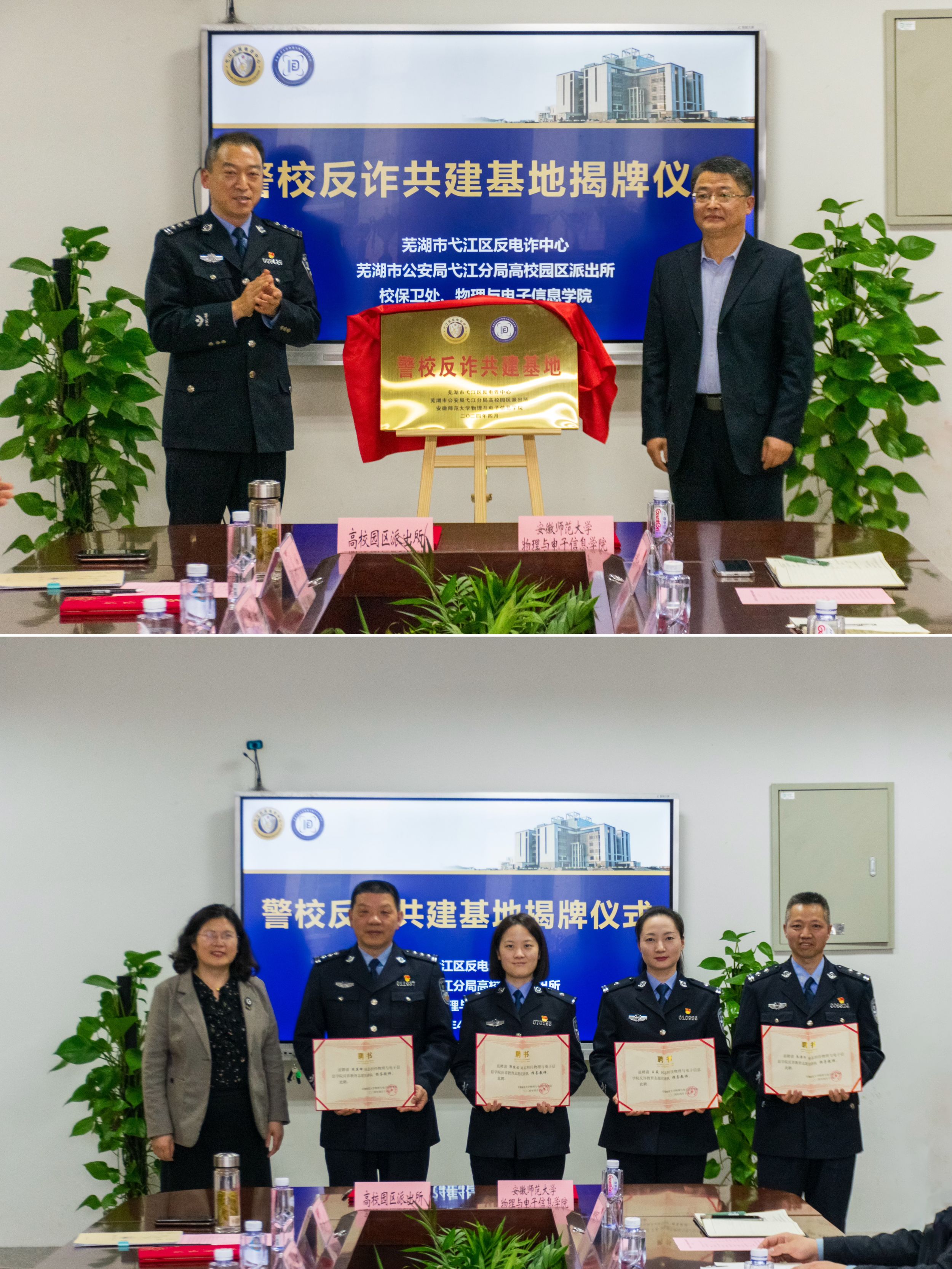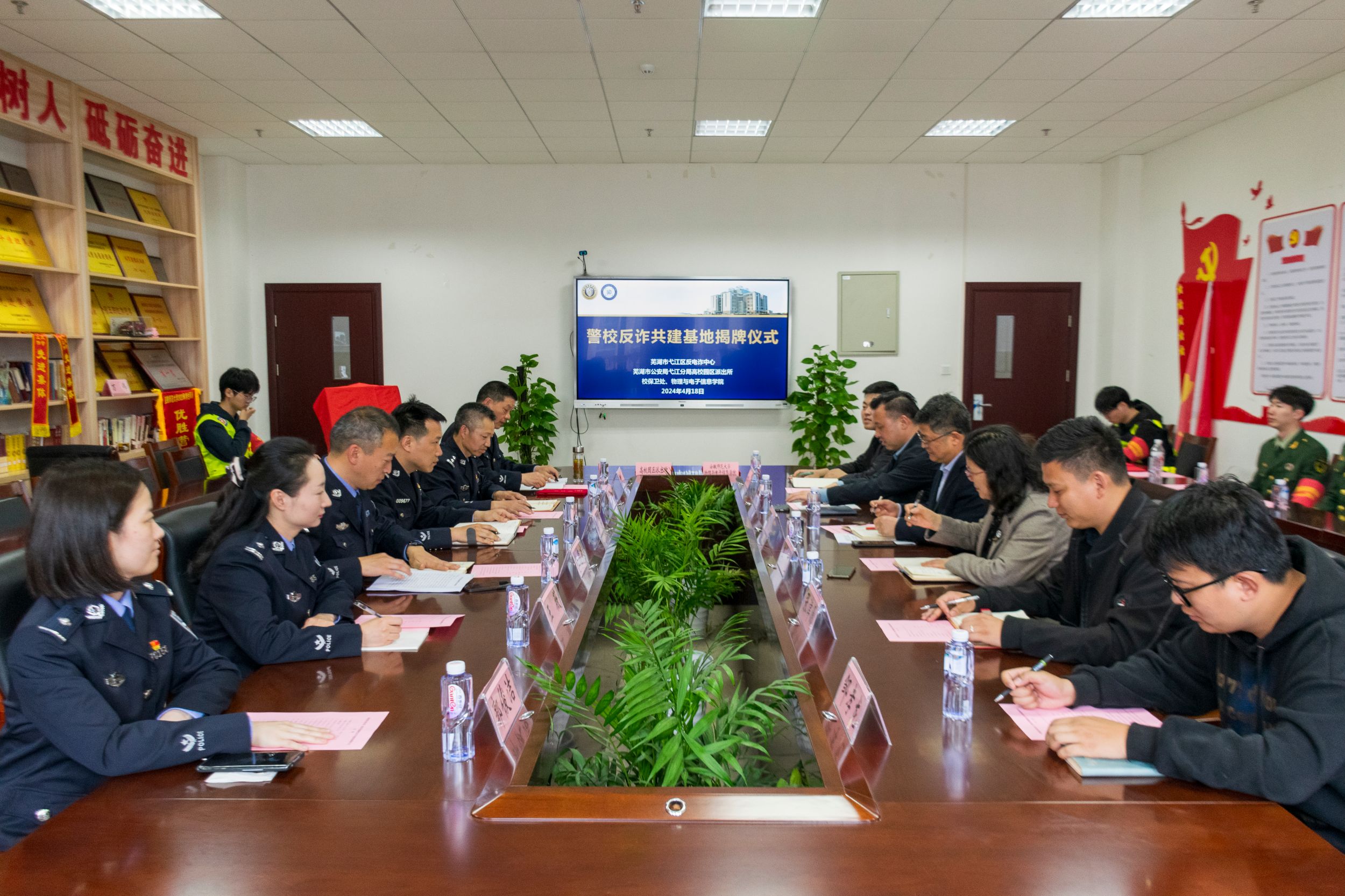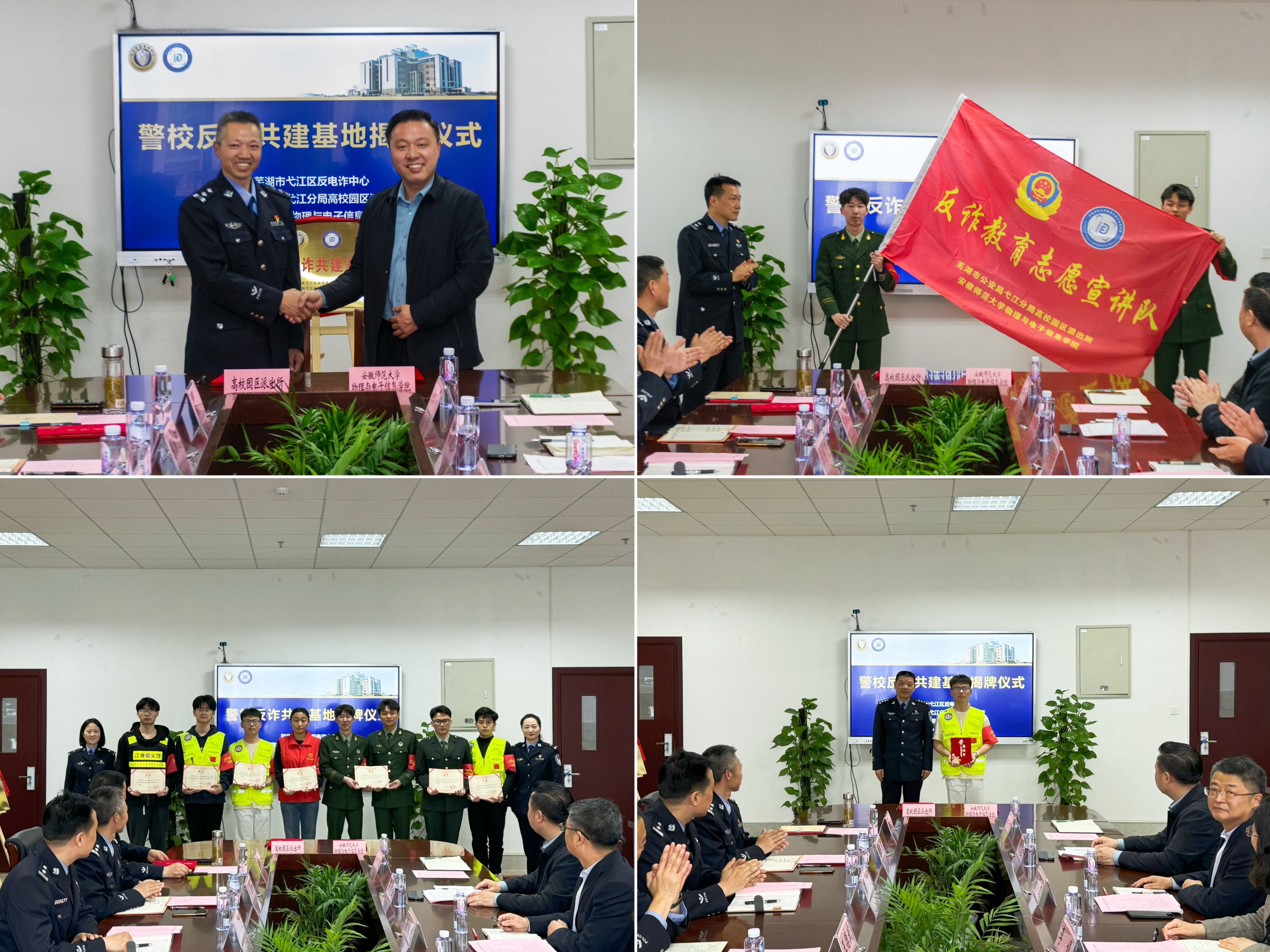 在物理楼308会议室举办了警校共建反诈基地揭牌仪式,高校园区派出所所长王德武,弋江分局综合打击队教导员汪国飞,高校园区派出所民警周英坤、朱滦河,弋江分局反诈中心王薇、郭俊洁,学校保卫处处长唐俊生,免费足球直播app