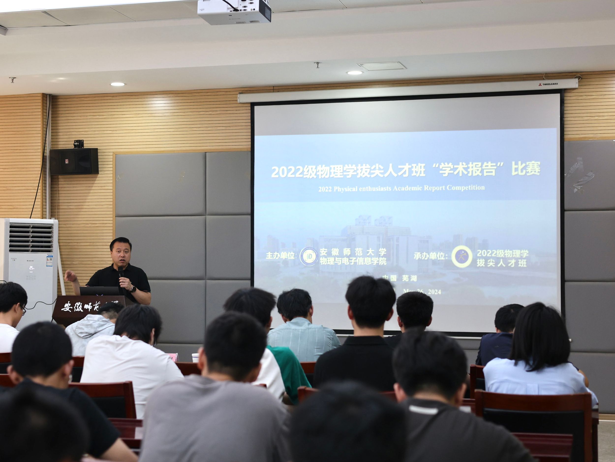 党委副书记黄友生、院物理学平台专业老师秦正波、吴贵渊、徐飞、潘琮、钱士峰担任评委,2022级物理学拔尖人才班赵文涵同学主持比赛,2022级物理学拔尖人才班全体同学观摩比赛。