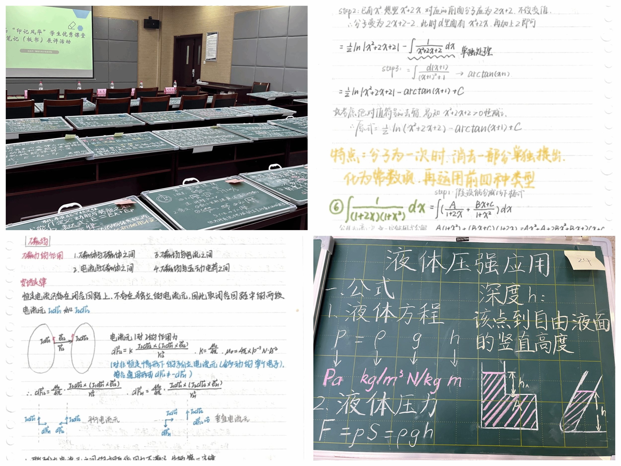 本次展评分为纸质笔记和黑板板书两个部分。格物致理,百记成书,一闪而过的学习思维经过笔墨纸砚的神奇转化便获得时空的永恒,得以反复咀嚼和内化,一帧帧简洁工整、内容详实的笔记是物电学子们细细耕耘,渴望收获的体现;粉墨师大,笔抒中华,汪志荣老师强调“黑板板书不仅仅需要字写得认真规范,还需要一定的排版设计”,同学们充满新意、精心设计的黑板板书勾勒出知识的线条,是向学生传达知识和思想的重要媒介,具有示范引领、立德树人的作用。