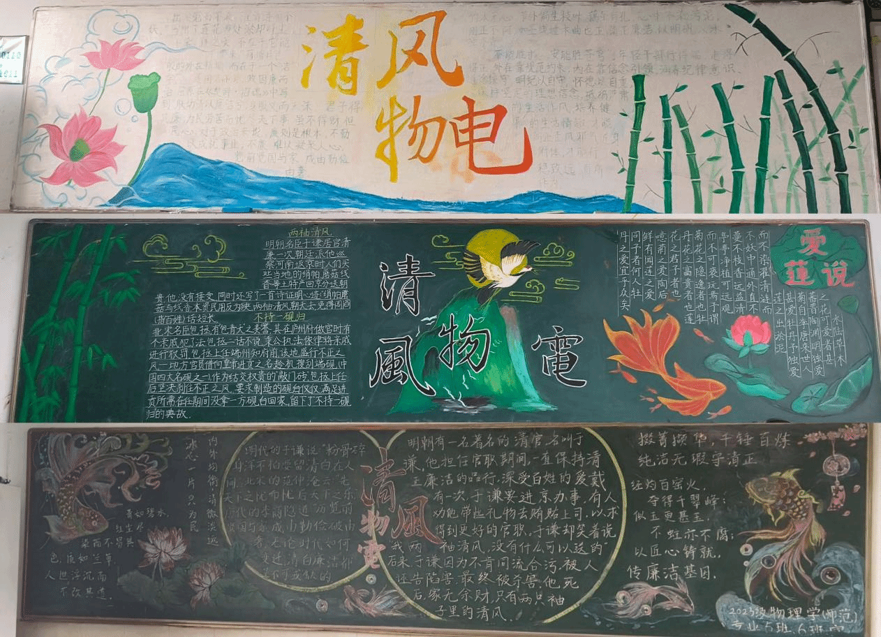 在毕业季立足新时代廉洁文化“一院一品”创建活动,线下2023级物理学(师范)专业各班级围绕“清风物电”的主题,对所属责任教室进行了精心布置和装饰,从墙面的设计到角落的布置,从板报的绘制到饰品的点缀,充分营造了清风正气满校园的良好育人环境;线上结合“物电学生核聚变”公众号等平台,发布《清风启程,行稳致远:致免费足球直播app