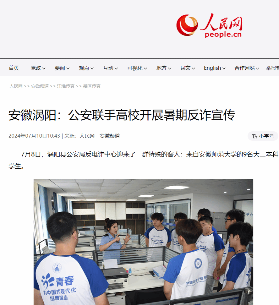 7月8日,涡阳县公安局反电诈中心迎来了一群特殊的客人:来自安徽师范大学的9名大二本科学生。