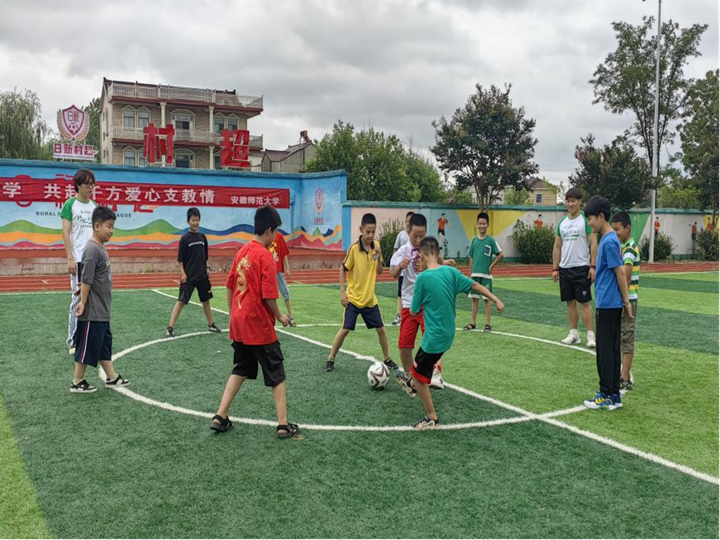为了让团队成员能与同学们融洽相处,拉近与同学们之间的距离,团队表演了舞蹈等节目。舞蹈小老师用一段精彩的舞蹈换来了小朋友们灿烂的笑容和热烈的掌声,表达他们对老师们的满意与期待。在舞蹈课上,同学们非常配合小老师的教学,这是对于很多同学来说的第一次舞蹈学习,节拍响亮,舞姿轻盈,在老师的带领下越跳越整齐,越跳越自信,盈盈舞姿展现小朋友们的青春风采。在足球游戏中,体育老师给同学们耐心讲述游戏规则,同学们都听的很仔细,不明白的地方也知道主动向老师们询问。游戏中同学们活力四射,接球和踢球的动作也越来越熟练。小老师们带领同学们开展有趣的击鼓传花游戏,被选中的幸运儿就要背诵一首诗词。小朋友们在兴奋紧张的游戏互动里与老师、同学迅速熟络起来,每背诵完一首诗词都会获得热烈的掌声,一个个小脸上绽放出甜美的笑容,这种笑容正是爱心支教团队想要守护的。