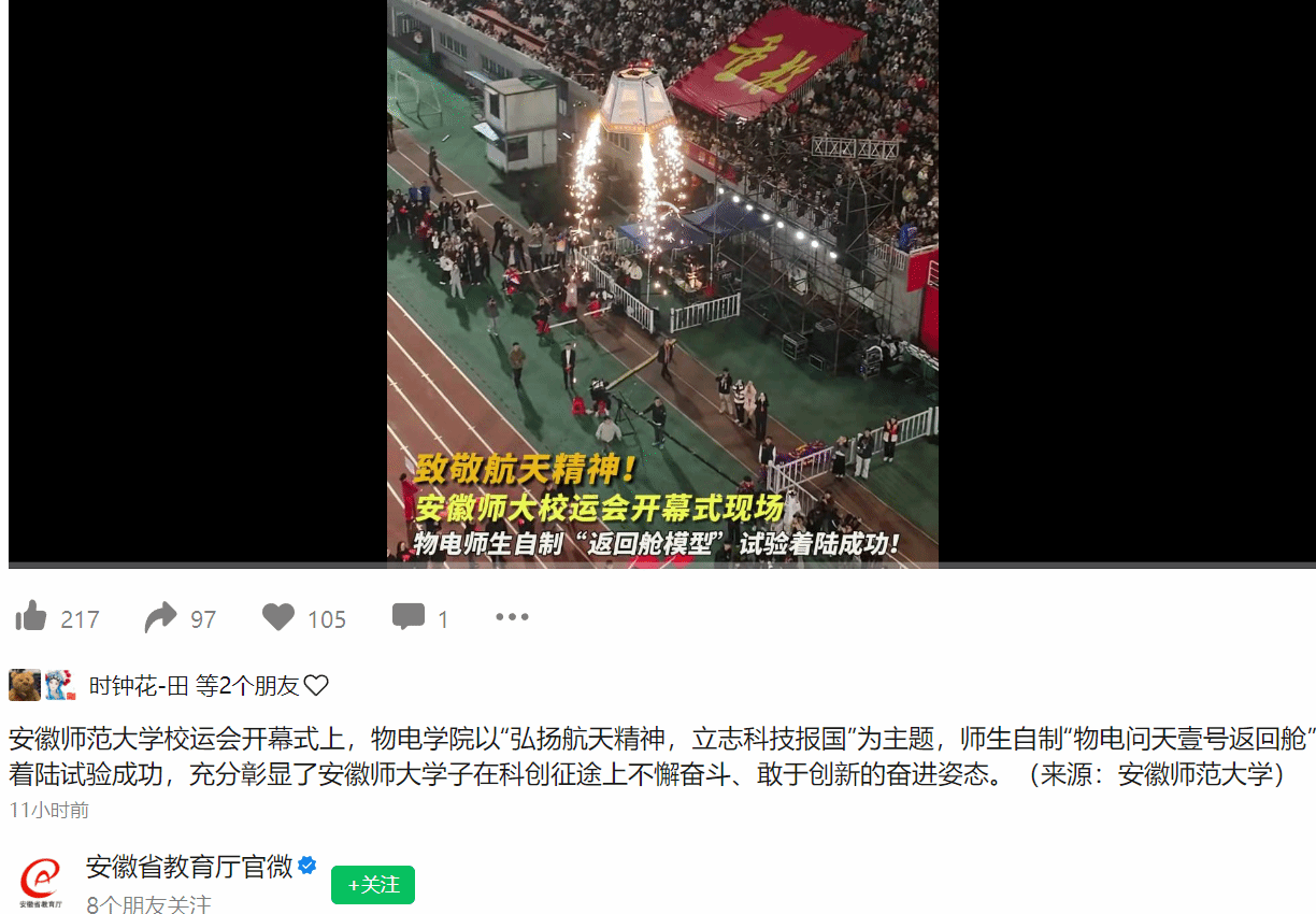 安徽师范大学校运会开幕式上,免费足球直播app 以“弘扬航天精神,立志科技报国”为主题,师生自制“物电问天壹号返回舱”着陆试验成功,充分彰显了安徽师大学子在科创征途上不懈奋斗、敢于创新的奋进姿态。