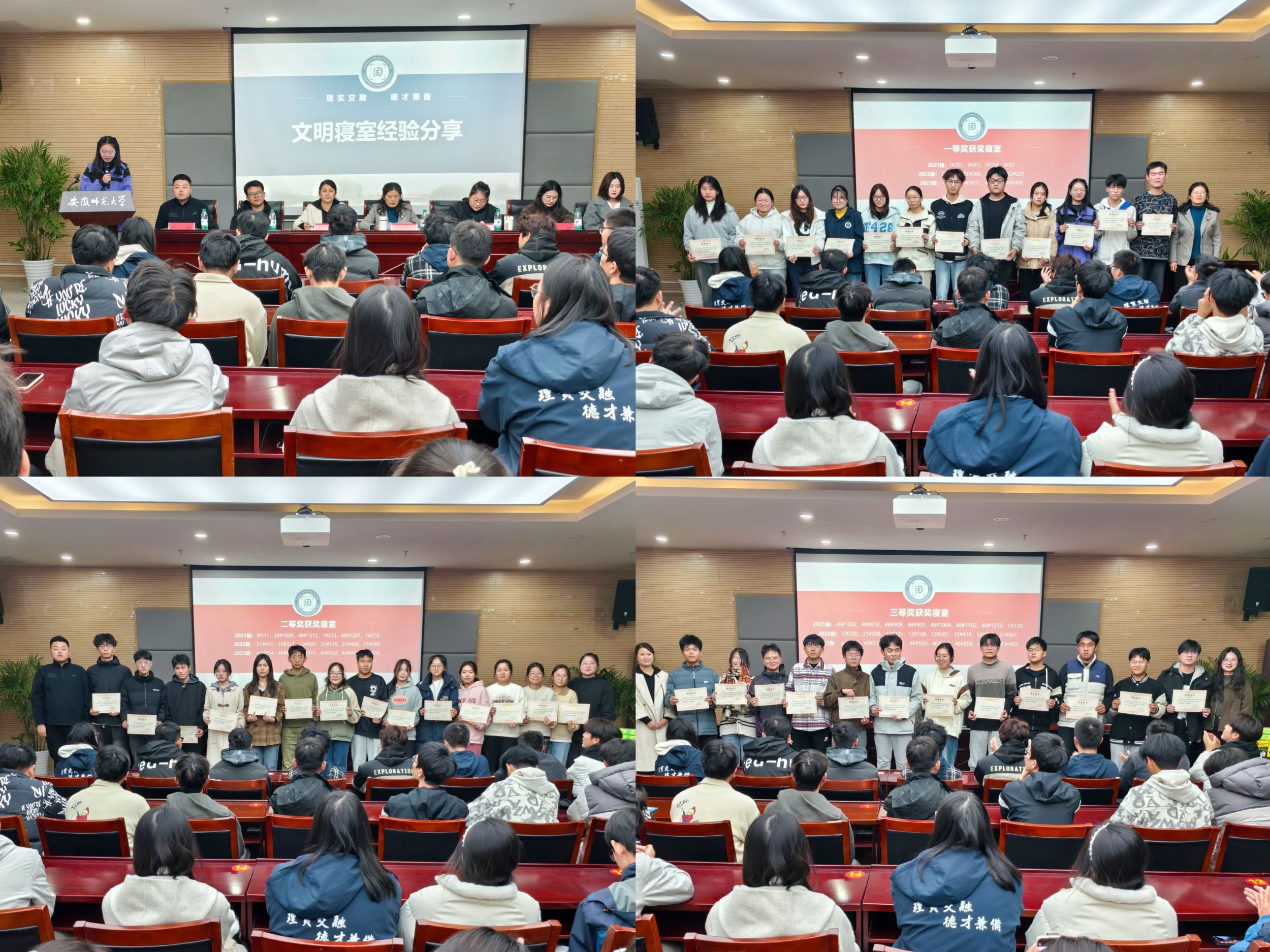 卫生督导情况,一学年累计检查寝室2700余间,通报表扬216间优秀寝室,通报批评135间脏乱差寝室,本次在21、22、23三个年级共表彰一等奖寝室12间、二等奖寝室18间、三等奖寝室24间。文明寝室代表许冉冉、钱墉从内务整理、寝室安全与和谐关系三个方面分享了经验,畅谈了文明寝室创建的重要性。随后,李娟等人为2023-2024学年获奖的优秀文明寝室代表颁发了证书和奖品。李娟在总结讲话中对获奖寝室表示祝贺,她表示,文明宿舍建设对塑造学生精神风貌具有深远影响,同时也是落实学校“六个文明”教育实践活动的重要举措,全体寝室在生活中要注重学习引领、讲究方法、自我控制和示范带头,共同把宿舍建设成文明和谐的“小社会”,温馨友爱的“小家庭”和共同进步的“小课堂”。