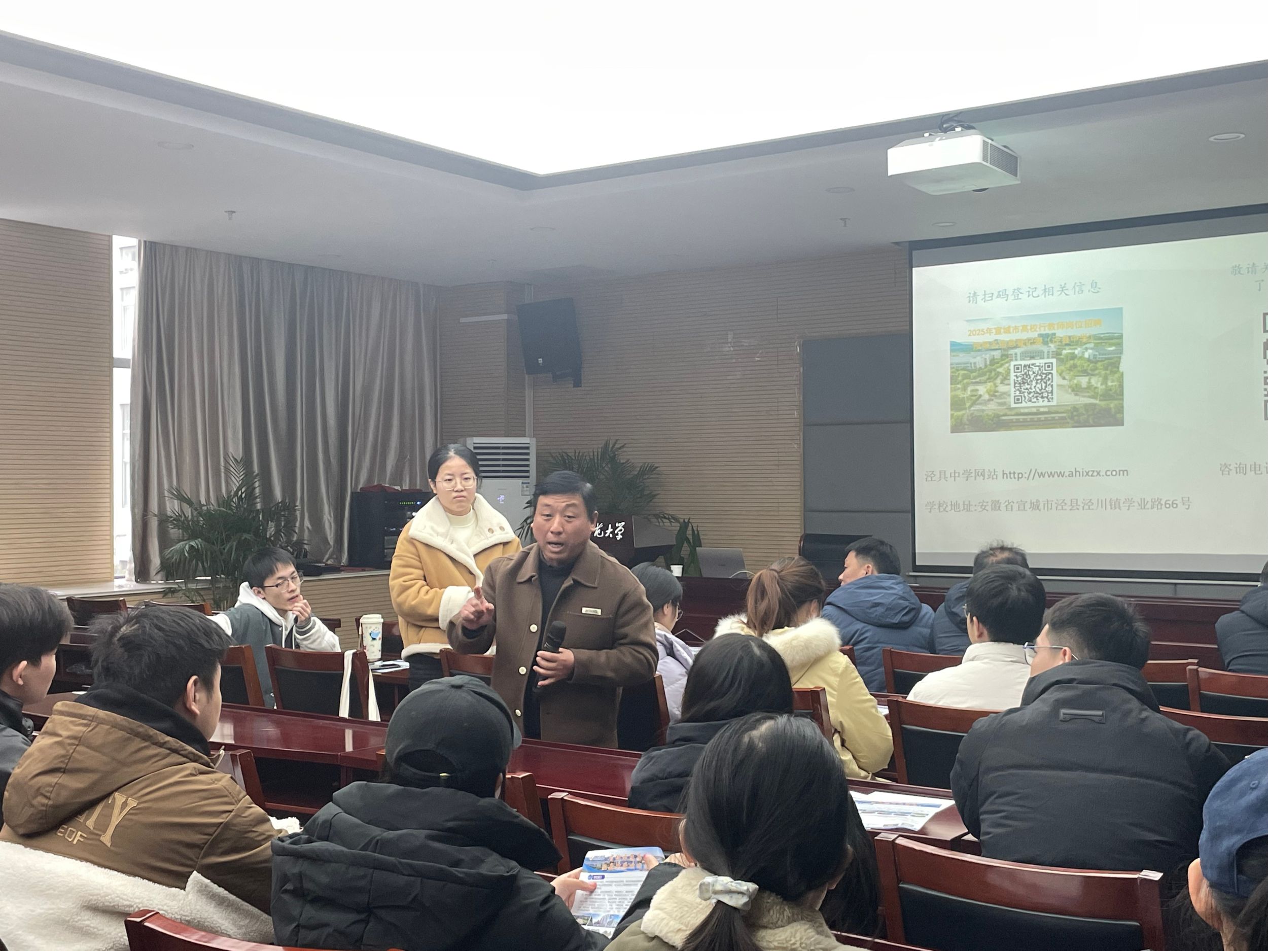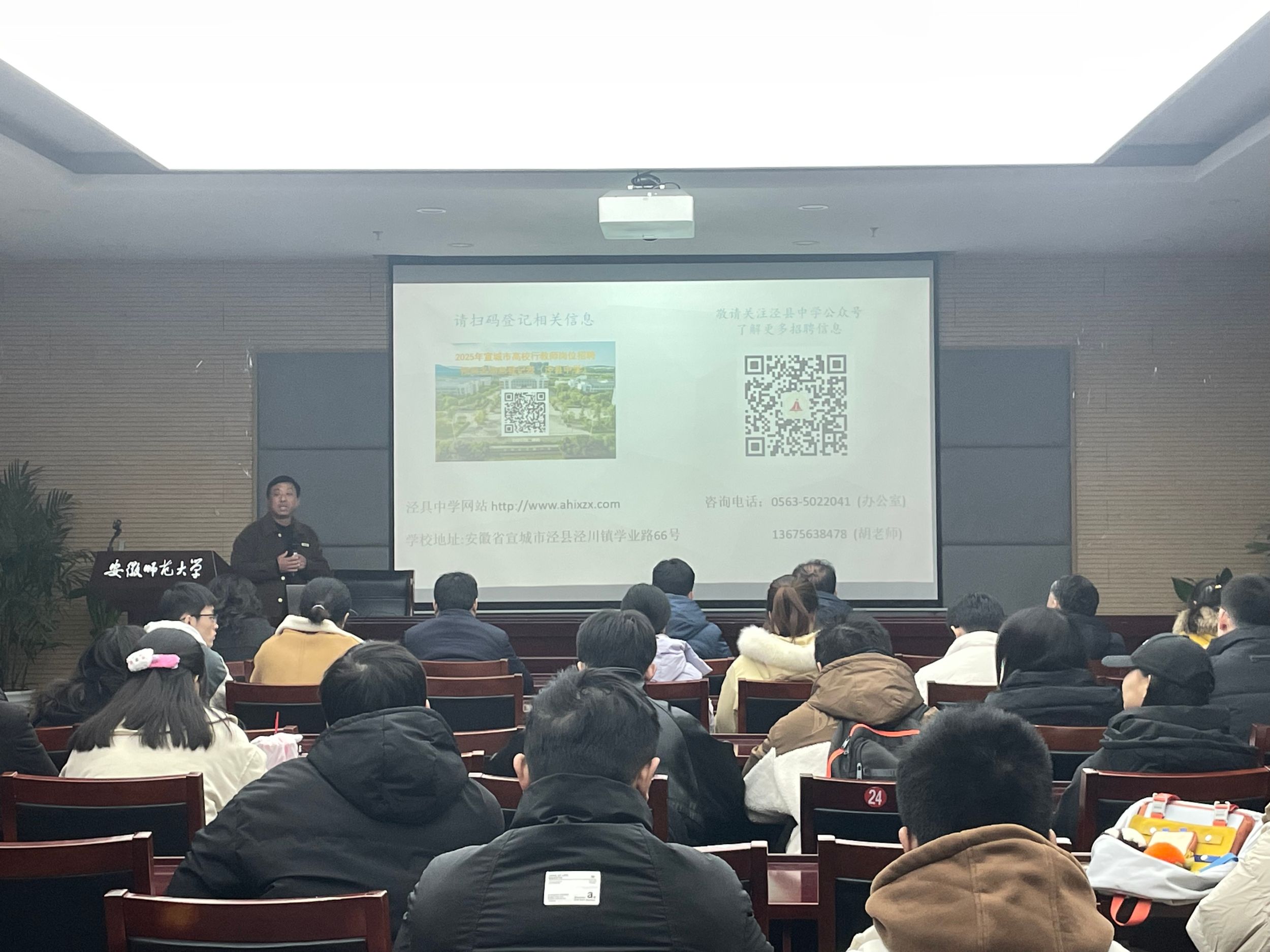 多功能报告大厅举行。泾县中学副校长胡承林采用视频推介与PPT宣讲相结合方式详细介绍了学校教学设施环境、校园活动、育人成果、招聘计划和岗位要求等方面的信息。他指出泾县中学一直致力于打造一支高素质的教师队伍,为学生提供更优质的教育资源,非常欢迎我校学子加入。宣讲会上,学生们积极提问,就职业发展、教育培训、福利待遇等方面的问题与泾县中学的领导进行了深入的交流和互动。泾县中学的代表们耐心倾听,逐一回答,现场气氛热烈而有序,让学生们感受到了真诚和热情。