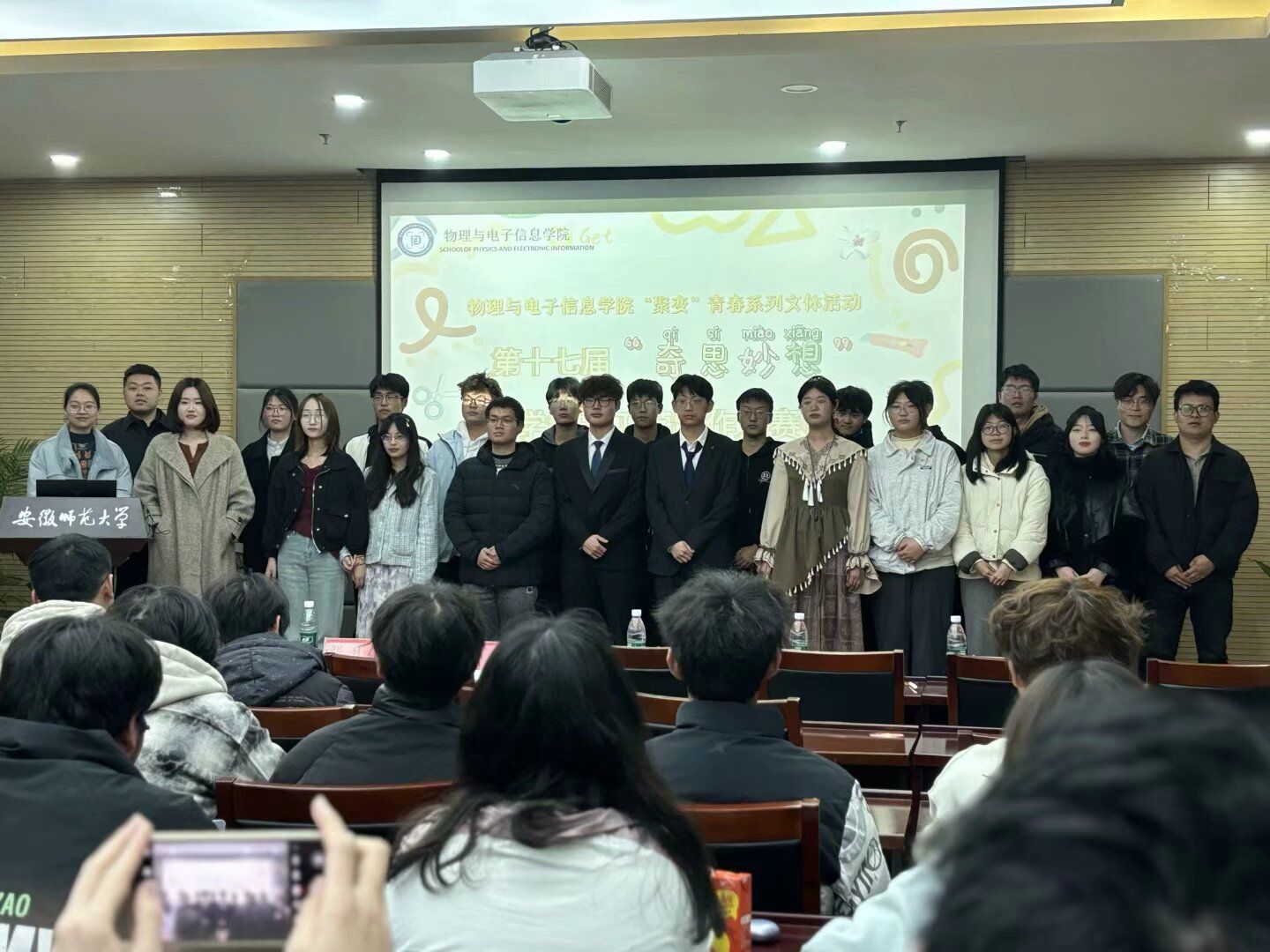 在物理楼304会议室举办第十七届“奇思妙想”手工艺品制作大赛。院团委书记布赫,院团委副书记、学生会指导教师邹孝龙,电子爱好者协会指导教师张月停,院学生会主席团成员聂小龙、许冉冉、杜梦蕊应邀担任评委。