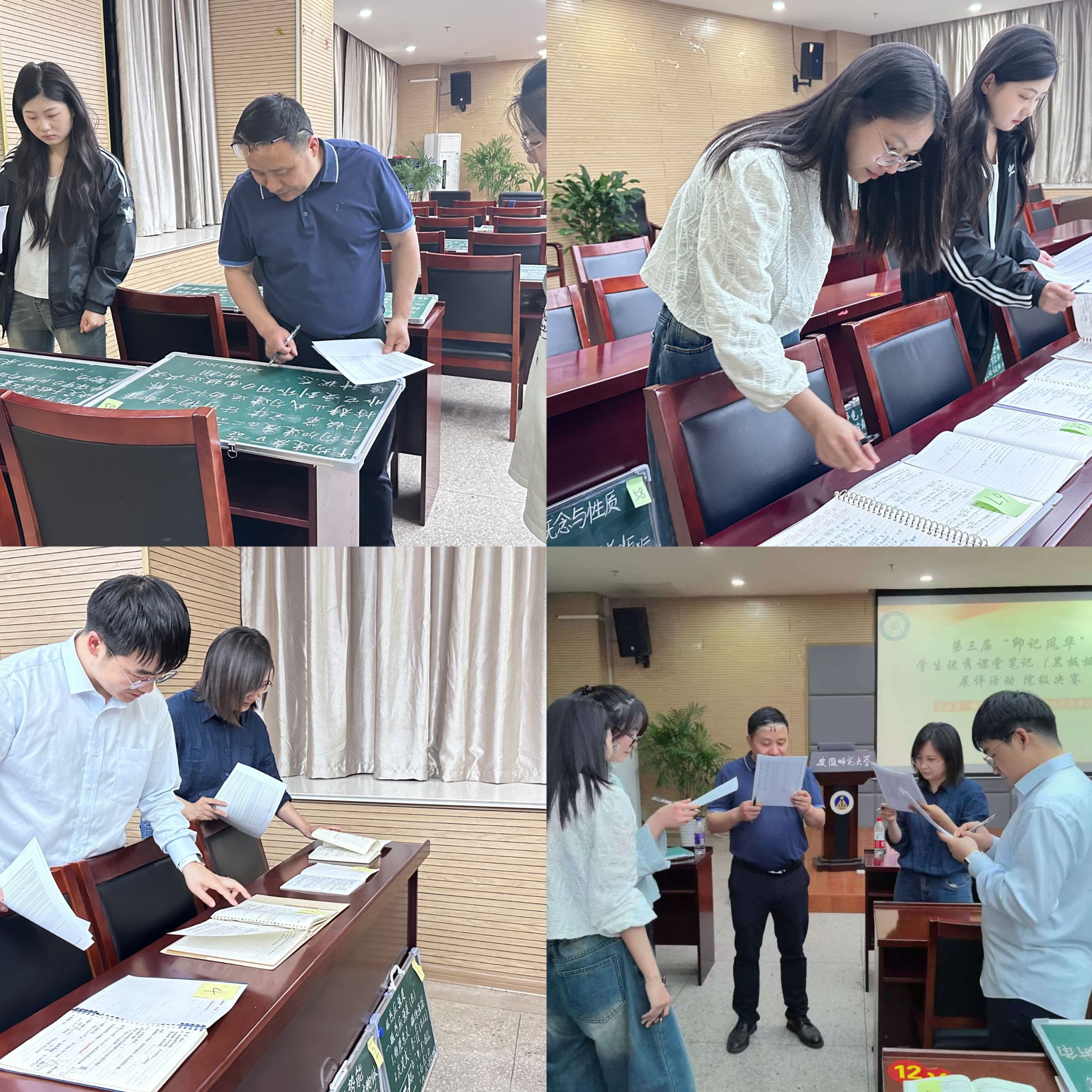 终评现场,一本本纸质笔记有序陈列,文字工整,图表精美,每一处书写都彰显着认真的态度;一块块黑板板书整齐排列,字迹刚劲,布局精巧,每一处板书设计都展露着扎实的功底和严谨的教学逻辑。评委们根据作品的编码顺序,采用现场评析的方式进行遴选,共评选出一等奖20名,二等奖40名,三等奖79名。